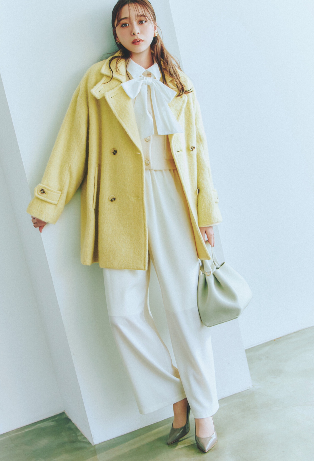 コート¥50,600(Stola./ストラ)、カーディガン¥14,300(COCO DEAL/ココ ディール)、パンツ¥27,500(カデュネ)、バッグ¥87,000(ポレーヌ)、靴¥18,150(ダイアナ 銀座本店<ダイアナ>)、イヤリング¥11,000(フーブス<IRIS47>)、リング¥29,700(アルティーダ ウード)、ブラウス/着回し