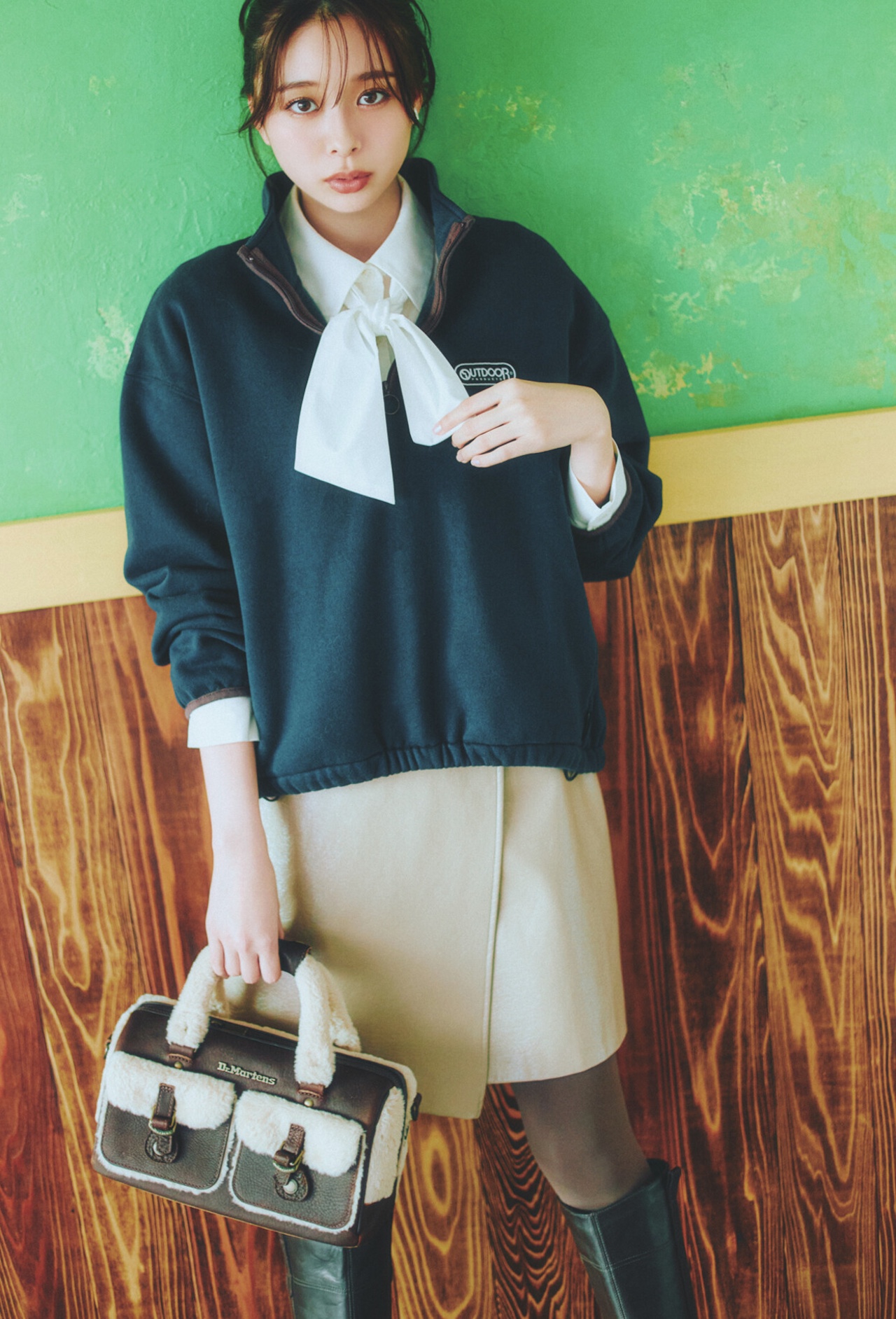 プルオーバー[OUTDOOR PRODUCTS別注]¥17,930(アルページュストーリー)、スカート¥7,920(アンティローザ<igi>)、バッグ¥35,200(ドクターマーチン・エアウエア ジャパン<ドクターマーチン>)、靴¥49,500(伊勢丹新宿本店 本館2階 婦人靴<ファビオ ルスコーニ>)、タイツ¥1,650(タビオ<靴下屋>)、イヤカフ¥13,200(アルティーダ ウード)、ブラウス/着回し