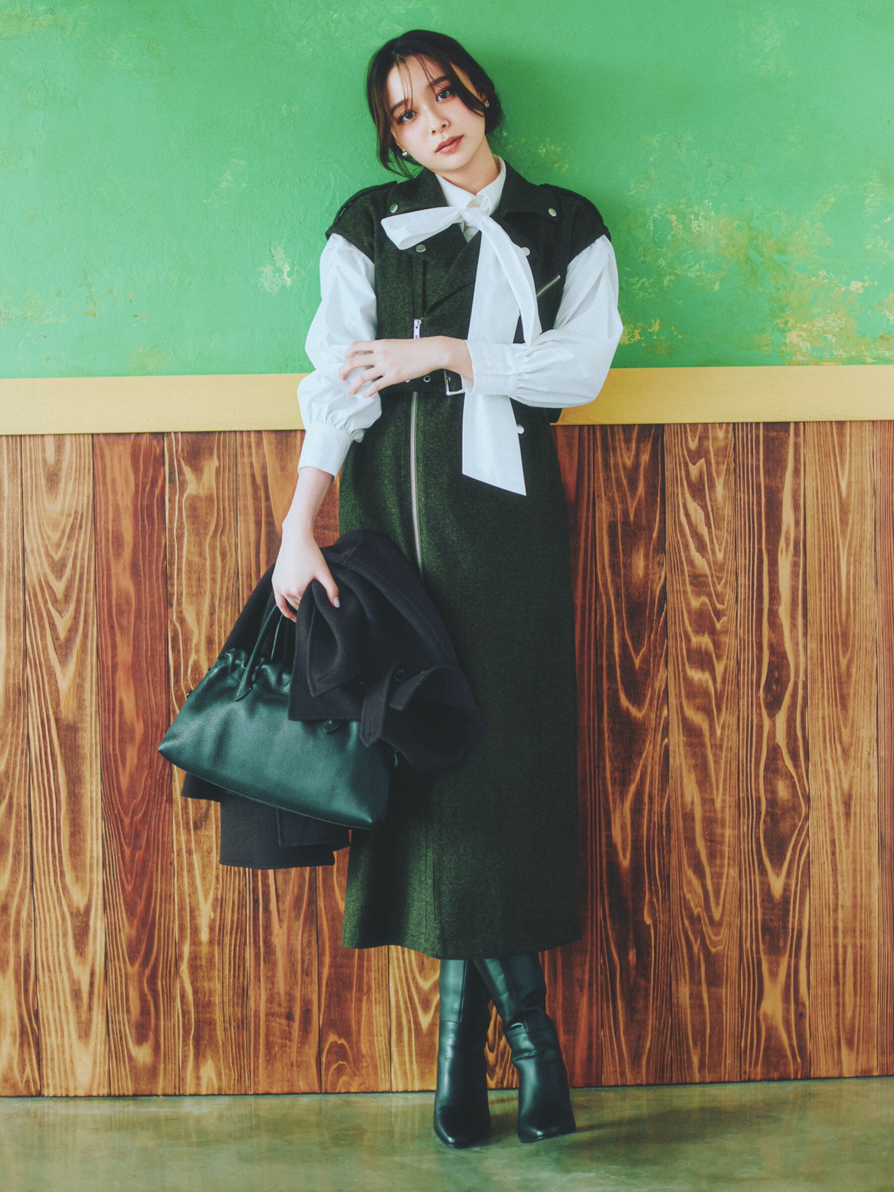 程よくドレッシーに楽しむならワンピとのレイヤリングが推し! ライダースディテールを効かせたキレのある1枚は、ボウタイブラウスと掛け合わせることで美人なムードに着地。黒小物でかっちり整えると社内でも浮かない♪