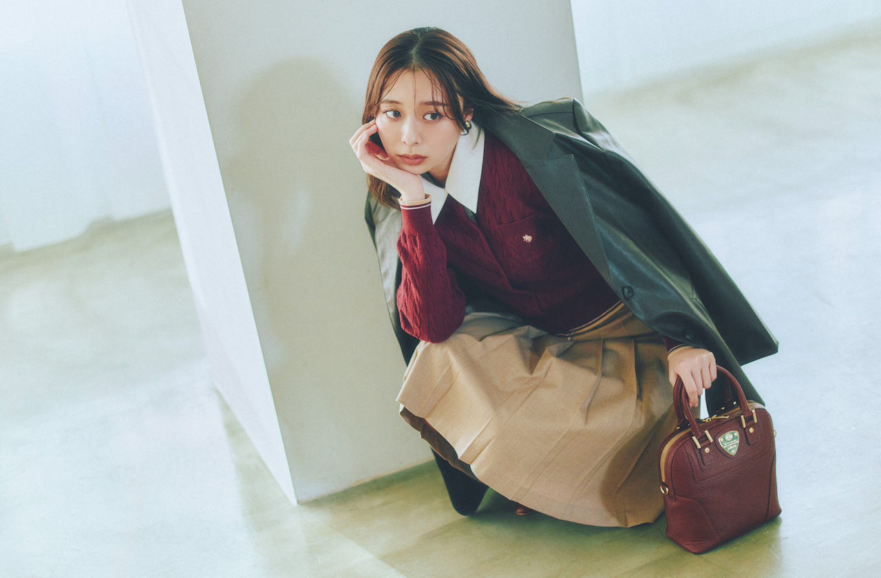 ジャケット¥25,900(célon)、カーディガン¥16,500(リランドチュール)、スカート¥6,600(PAL CLOSET<Discoat>)、バッグ¥53,900(スタジオアタオ<アタオ>)、靴¥20,350(ダイアナ 銀座本店<ダイアナ>)、靴下¥3,520(ドロワー<MARCOMONDE>)、イヤリング¥12,100(フーブス<IRIS47>)、ブラウス/着回し