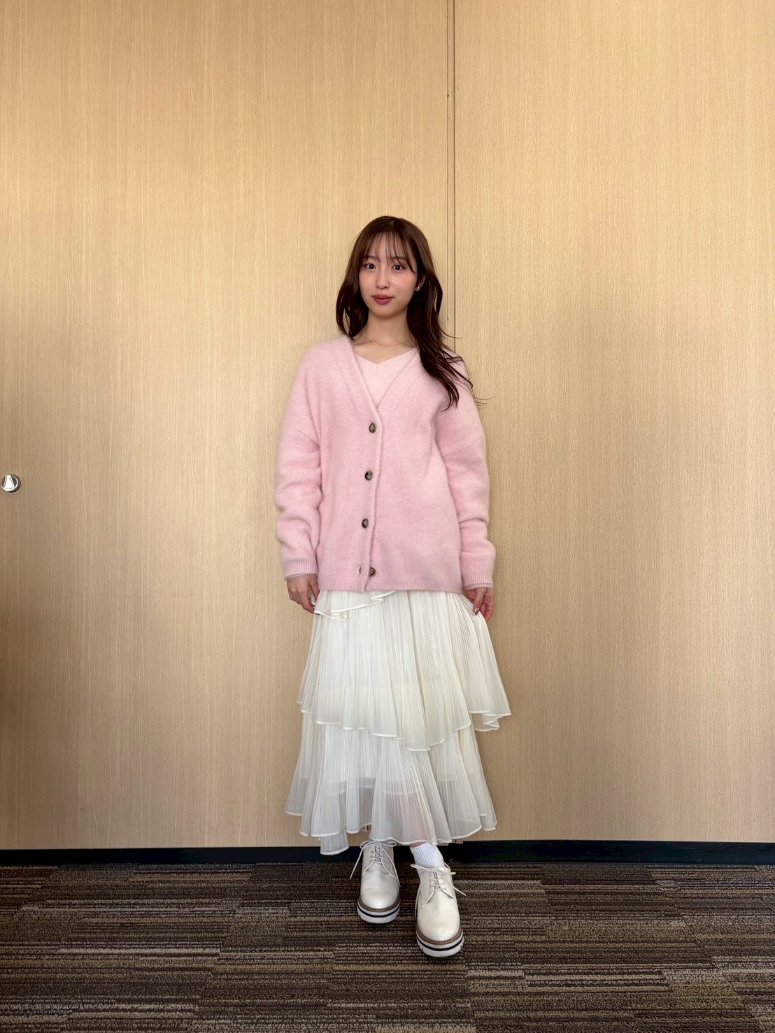 ブルゾン¥22,000(Ungrid)、カーディガン¥33,000(TONAL)、プルオーバー¥29,700(TONAL)、スカート¥19,800(SNIDEL)、靴¥3,300(神戸レタス)、イヤリング¥3,960(フィービー)