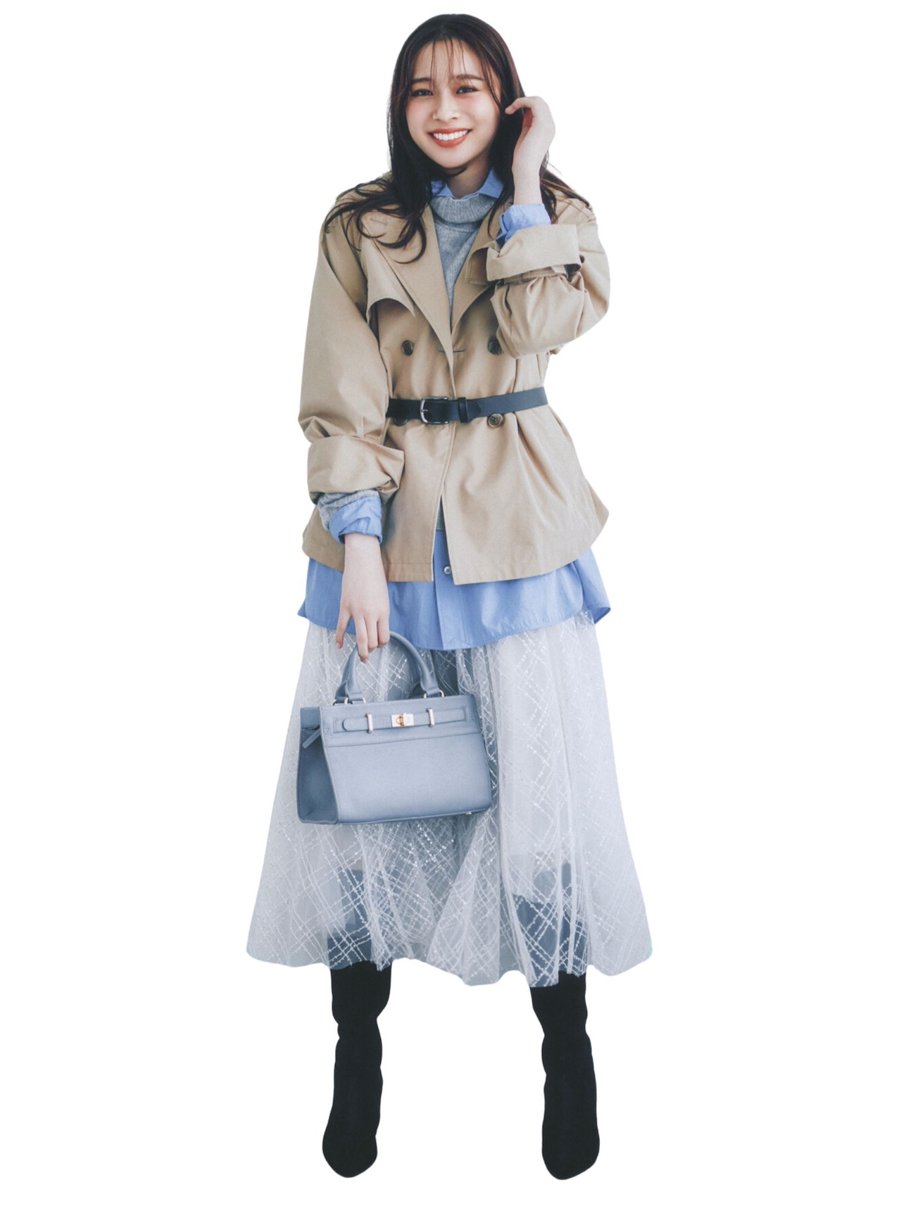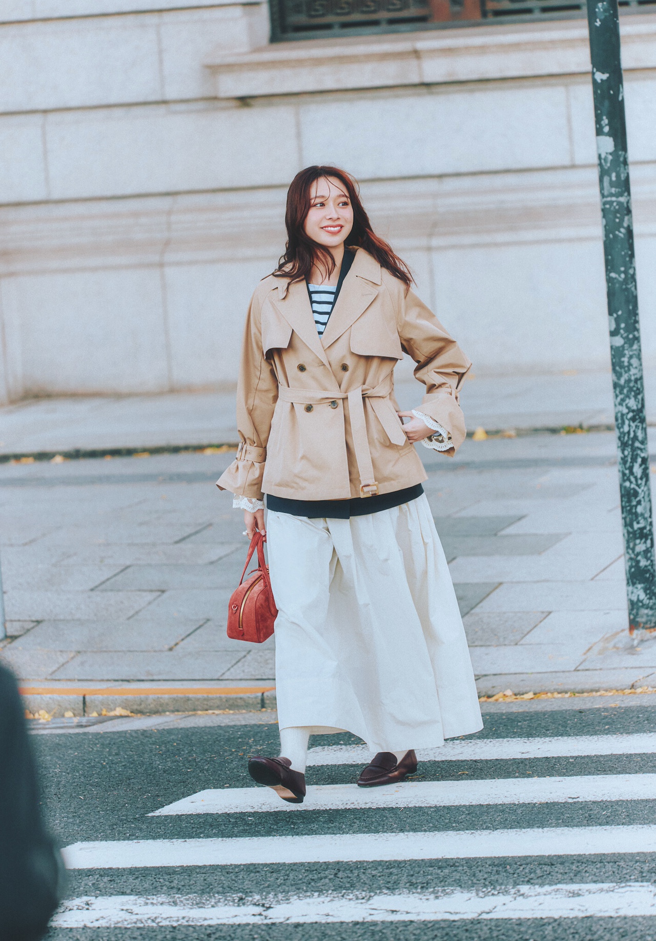 トレンチの下にジャケットを着込んであたたかく。白スカートで爽やかに着こなして、無理せず季節をスライド。