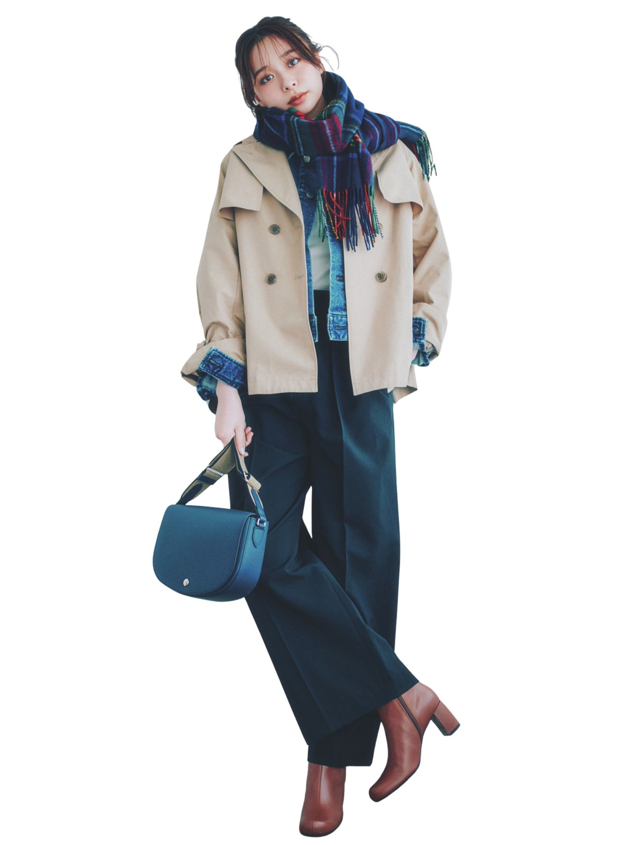 ジャケット¥22,000(ゲストリスト<ヘルシーデニム>)、ニット¥29,000(シーニュ)、パンツ¥15,400(N.O.R.C<ノーク>)、バッグ¥99,000(ロンシャン・ジャパン<ロンシャン>)、靴¥25,850(ダイアナ 銀座本店<ダイアナ>)、マフラー¥13,970(セムインターナショナル<TWEEDMILL>)、コート/着回し