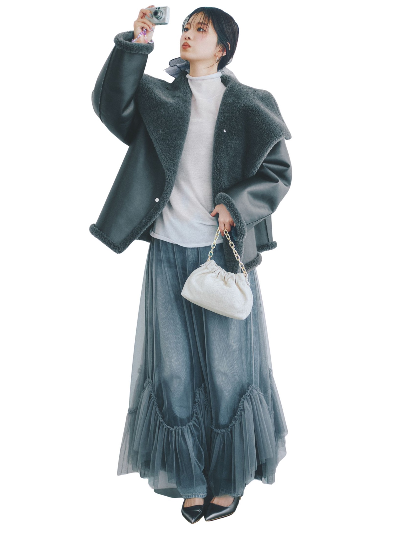 ソリッドな配色でも印象に残るのは、ドラマティックに広がるチュールスカートのおかげ。ジレはコンパクトなタイプを選ぶことでスカートのシルエットが際立ち、ふとした瞬間も素敵に見せてくれる♡