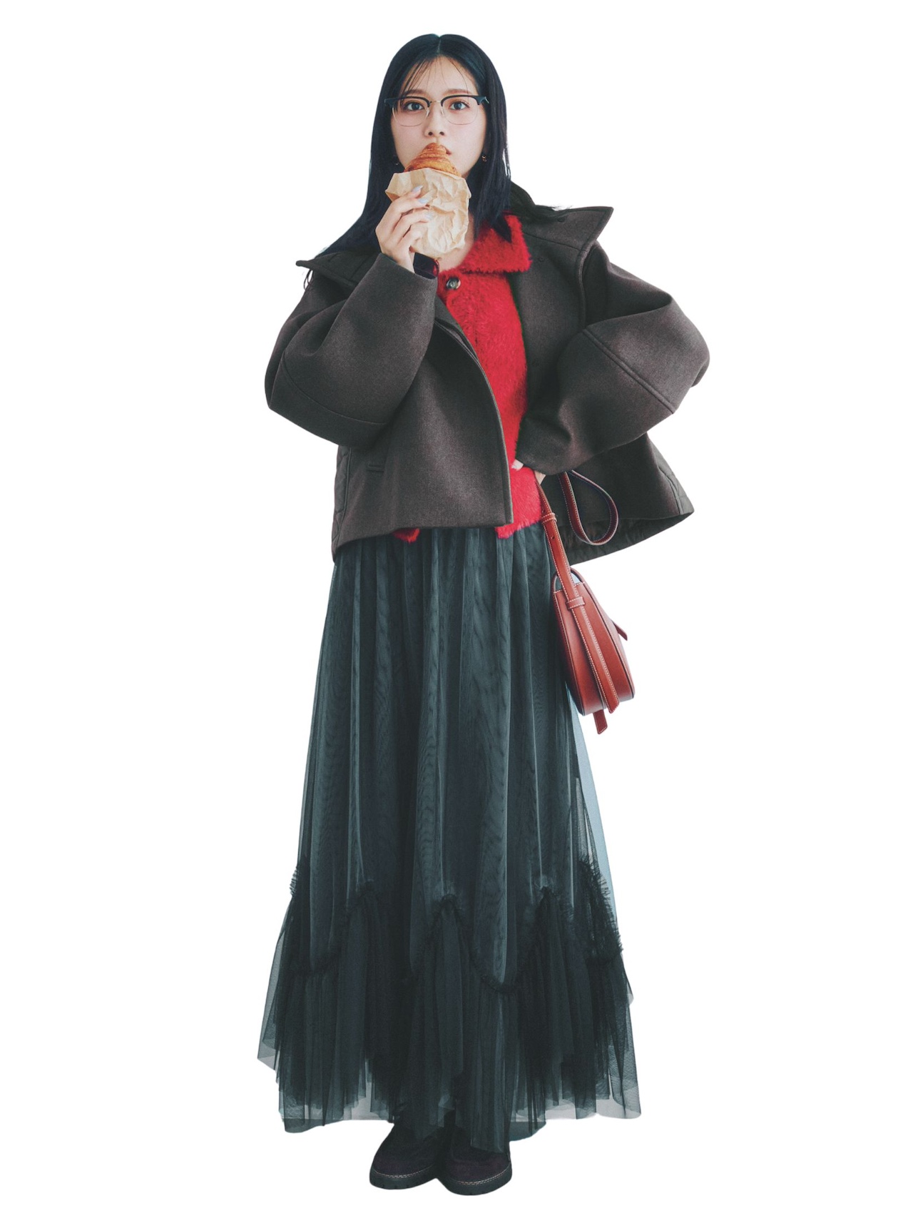 コート¥44,000(オンワード樫山<アンクレイヴ>)、カーディガン¥7,700(Ungrid<Ungrid>)、バッグ¥95,000(ポレーヌ)、靴¥31,680(セムインターナショナル<TRACHT TIROL>)、靴下¥1,210(タビオ<靴下屋>)、メガネ¥52,800(アイヴァン PR<E5 eyevan>)、ピアス¥18,700(ココシュニック<ココシュニック オンキッチュ>)、スカート/着回し