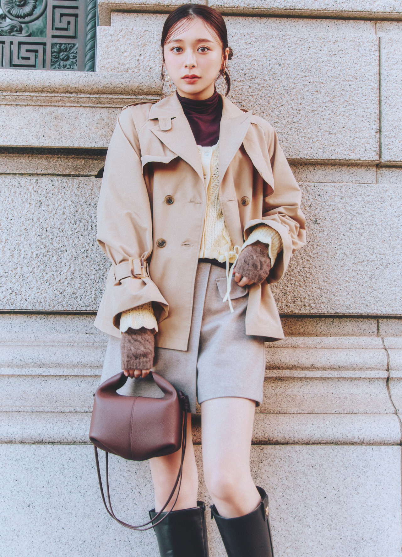 合わせるボトムのレングスを選ばないところも、ミディ丈トレンチを推せるポイント。ブラウン〜たまごイエローの落ち着いたグラデで大人のミニスタイルに。