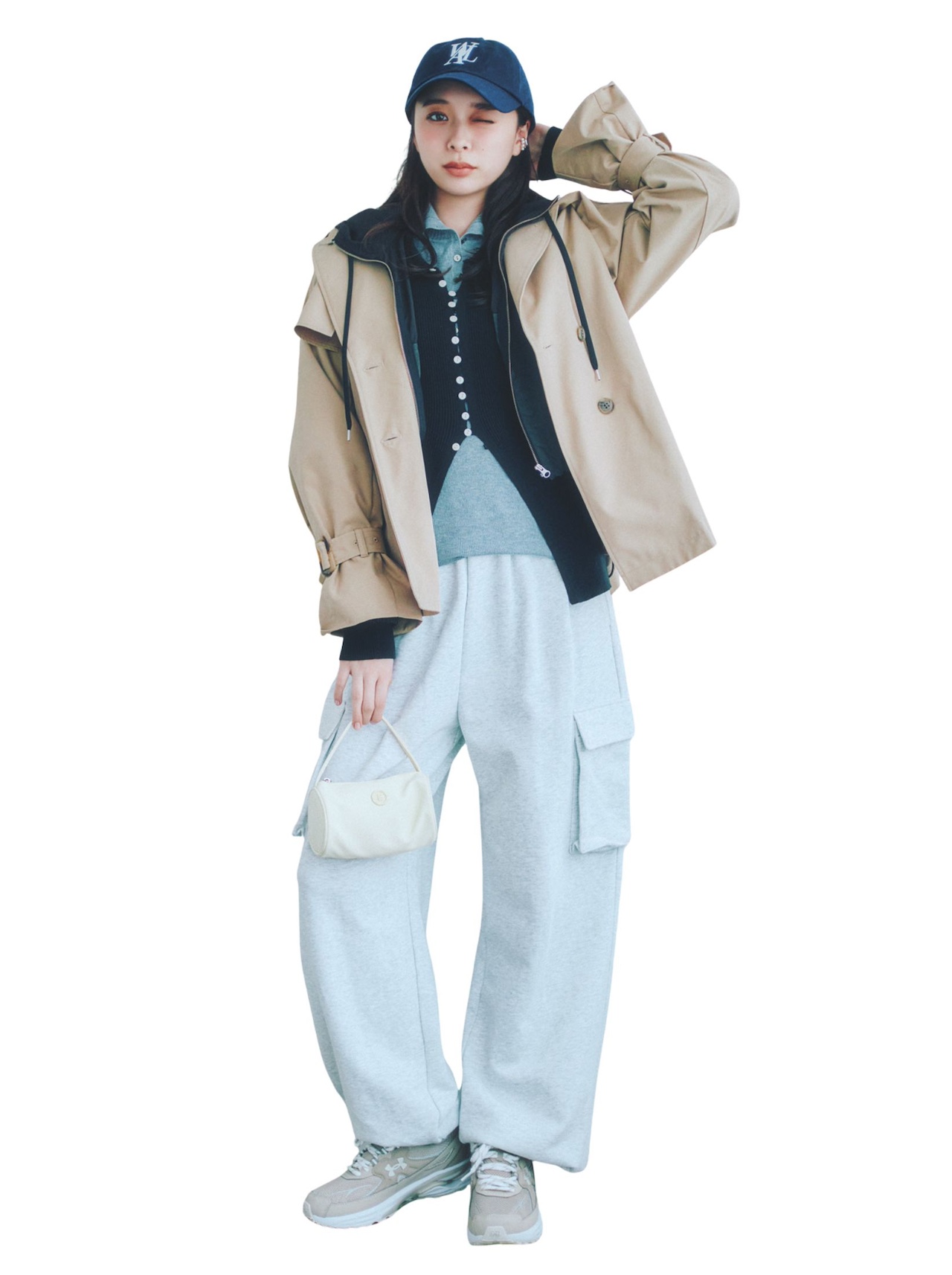 ブルゾン¥30,800(CODE A ルミネ新宿店<CODE A>)、カーディガン¥8,800(Ungrid<Ungrid>)、中に着たニット¥25,300(カイタックインターナショナル<ヤヌーク>)、パンツ¥16,500(AKTE)、バッグ¥11,330(HANA SHOWROOM<minitmute>)、帽子¥4,950(HANA KOREA<WOOALONG>)、靴¥17,930(ドーム<UNDER ARMOUR>)、イヤカフ¥2,970(フィービィー)、コート/着回し