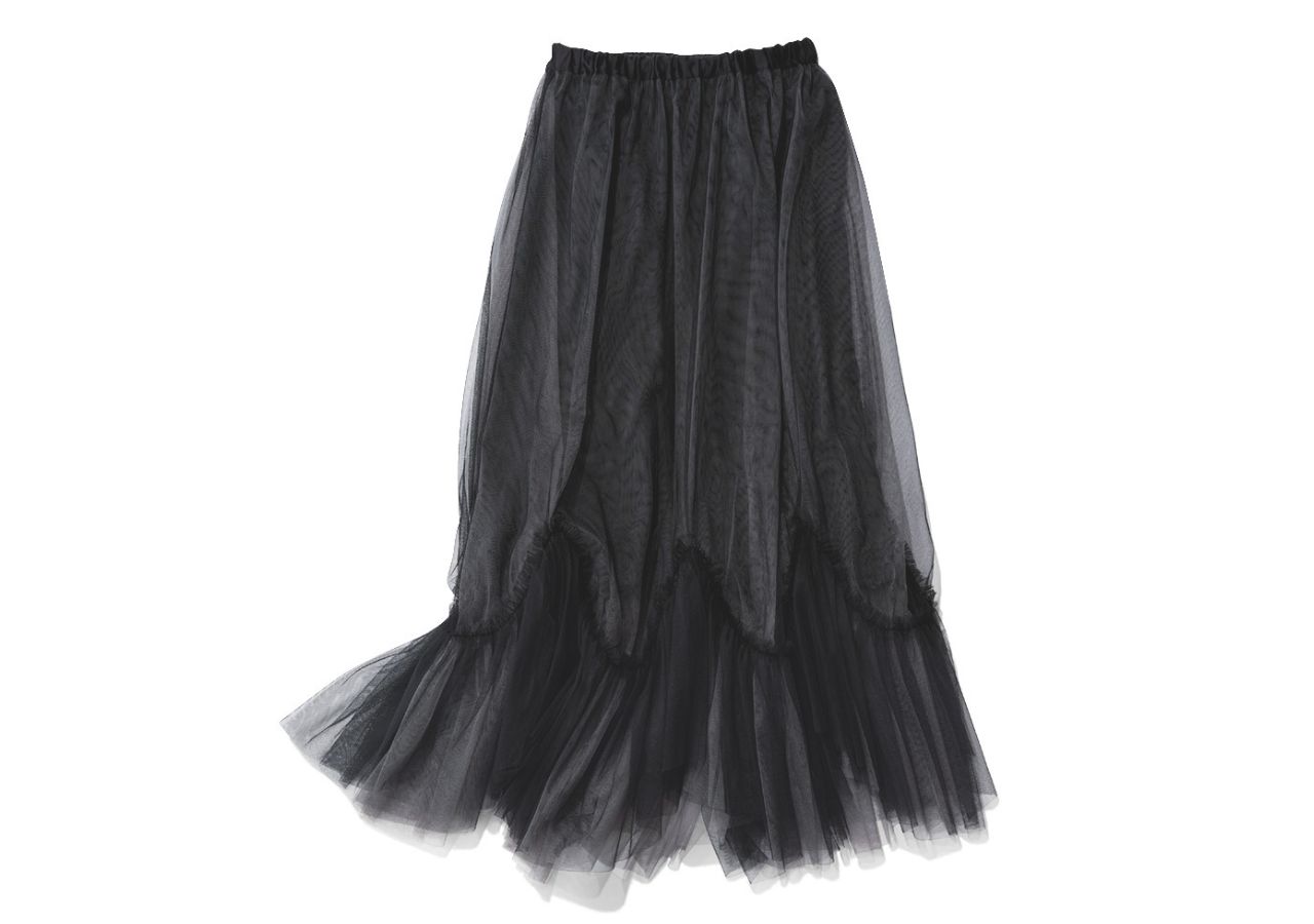 ランダムヘムで存在感たっぷりに仕上げたチュールスカート。グレーシャツでスタイリッシュに着こなすと、落ち着きがプラスされてオフィスにもマッチ。