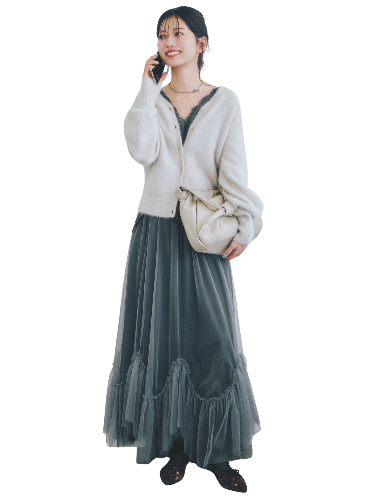 襟元からのぞかせたレースキャミとチュールスカートをグレーでつないで、特別感のあるワンピ風スタイリングに。上品なデコルテ見せもときめきを誘うポイント♡