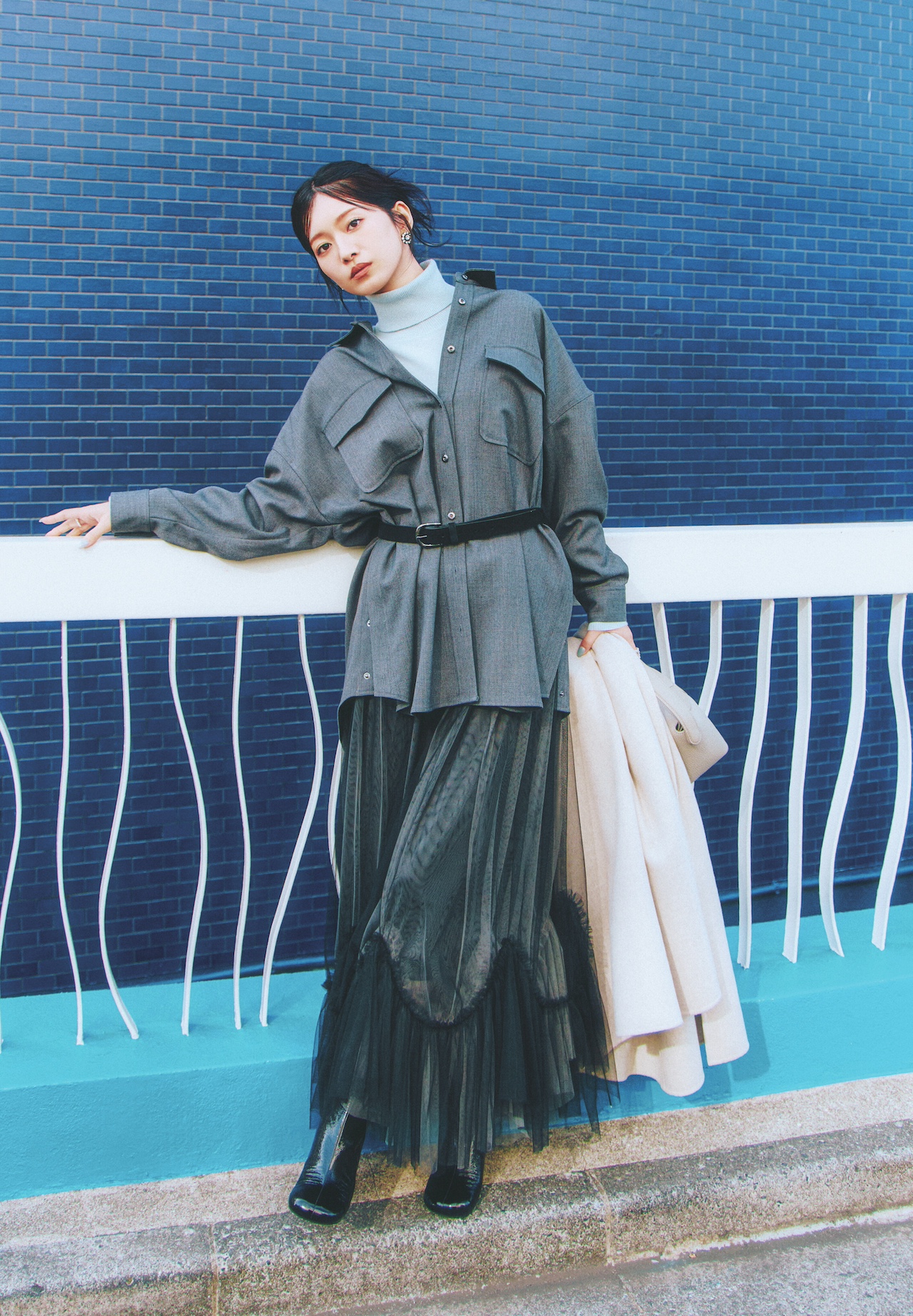 シャツ¥26,400(アルページュストーリー)、ニット¥19,800(N.O.R.C<ノーク>)、手に持ったコート¥59,400(アンタイトル)、バッグ¥47,300(ヴァジックジャパン<VASIC>)、靴¥29,700(アトリエブルージュ<ATELIER BRUGGE>)、ベルト¥7,990(Gap)、イヤリング¥3,630(mimi33/サンポークリエイト)、リング¥21,450 (ココシュニック<ココシュニック オンキッチュ>)、スカート/着回し