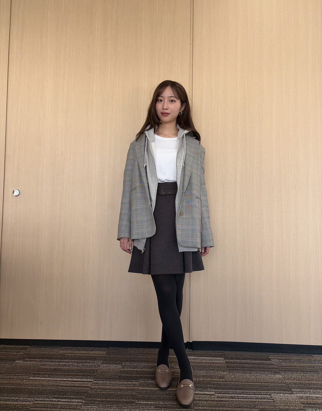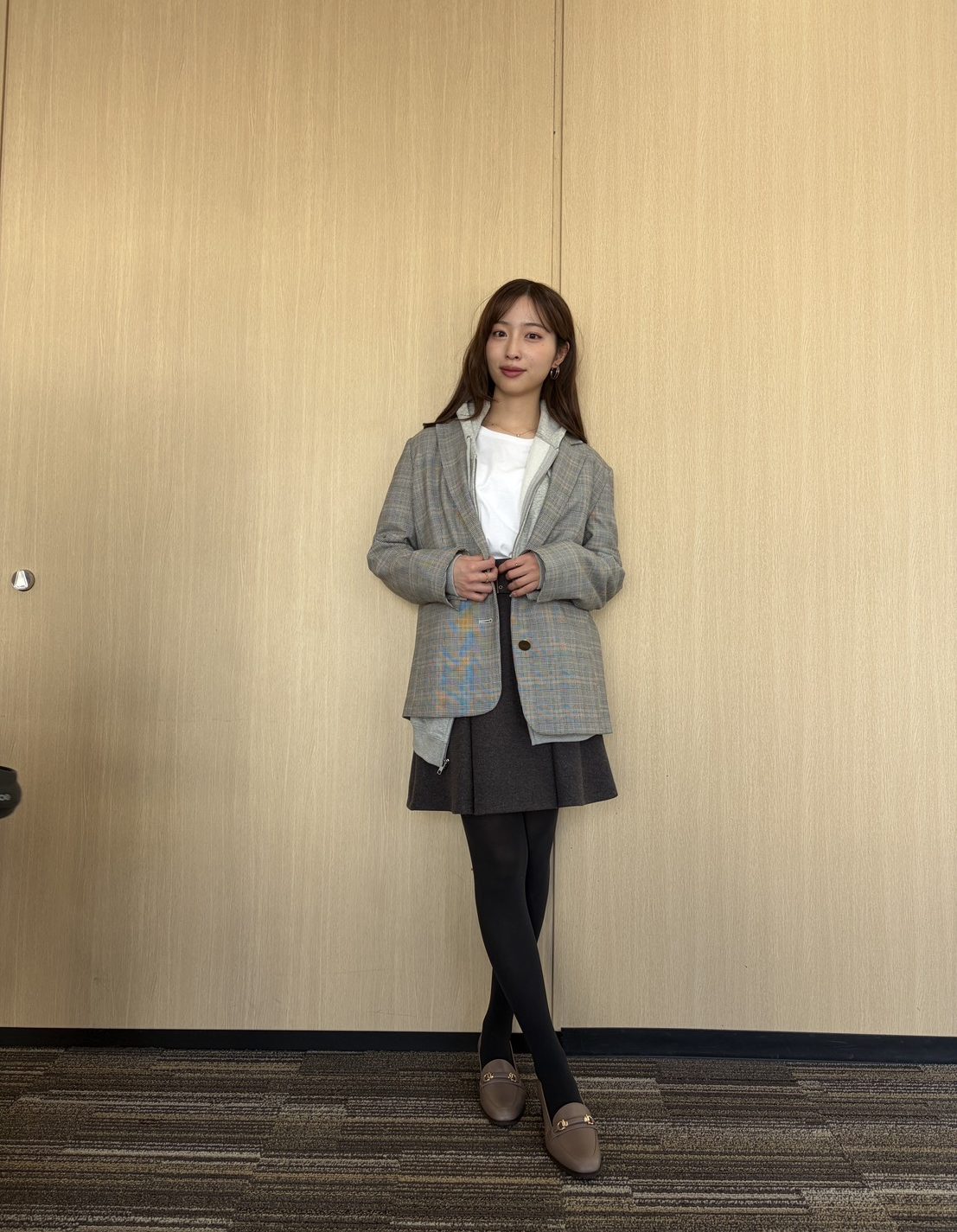 コートの下にジャケットとパーカを重ねた、今っぽいレイヤードスタイル。チラリとのぞくチェック柄やパーカのフードがこなれたアクセントに。3枚ともグレー系で統一することで、まとまりが生まれて洗練度がUP!