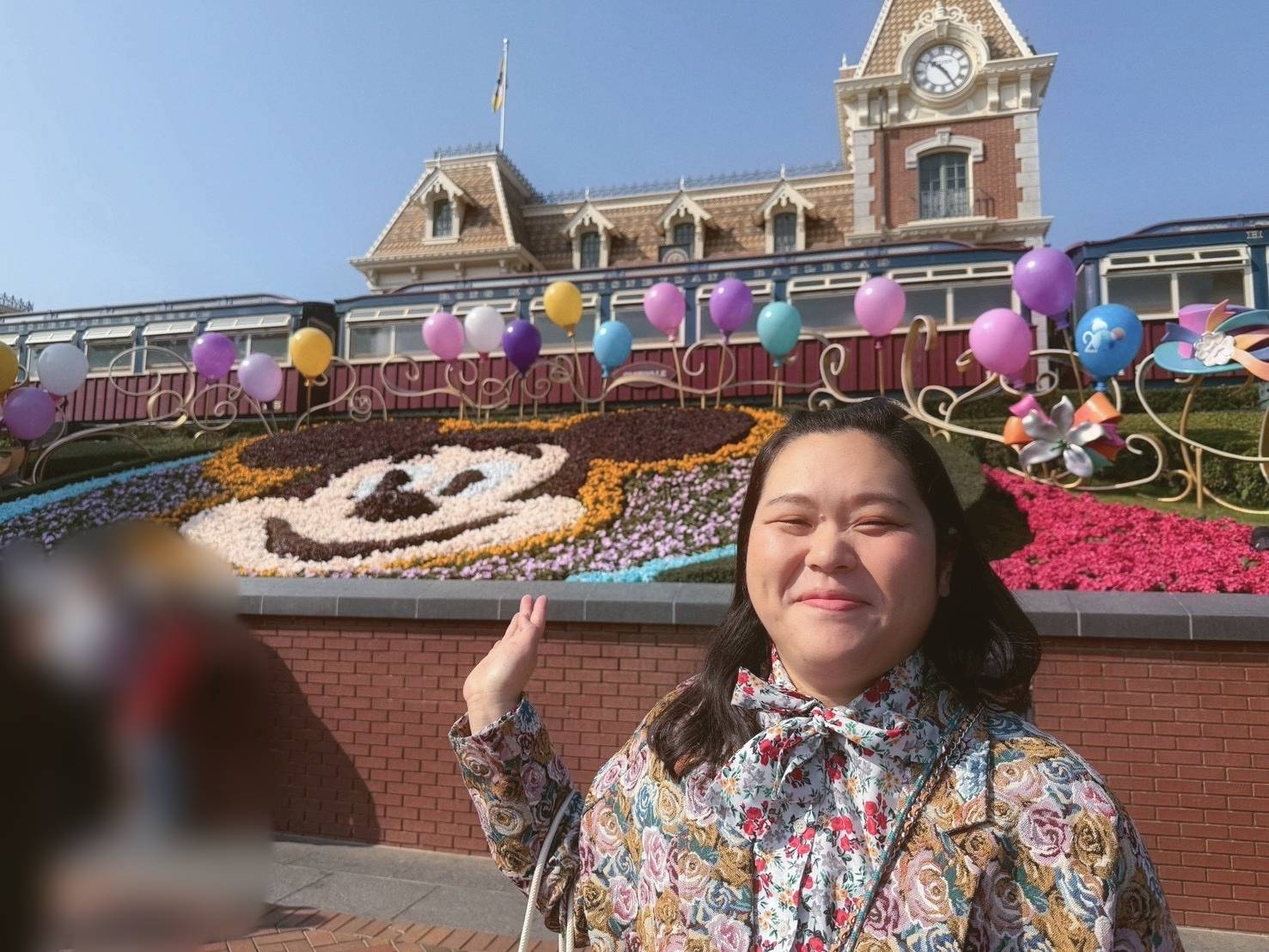 笑顔のミッキーフェイス花壇と共に、田辺さんも満面の笑み。