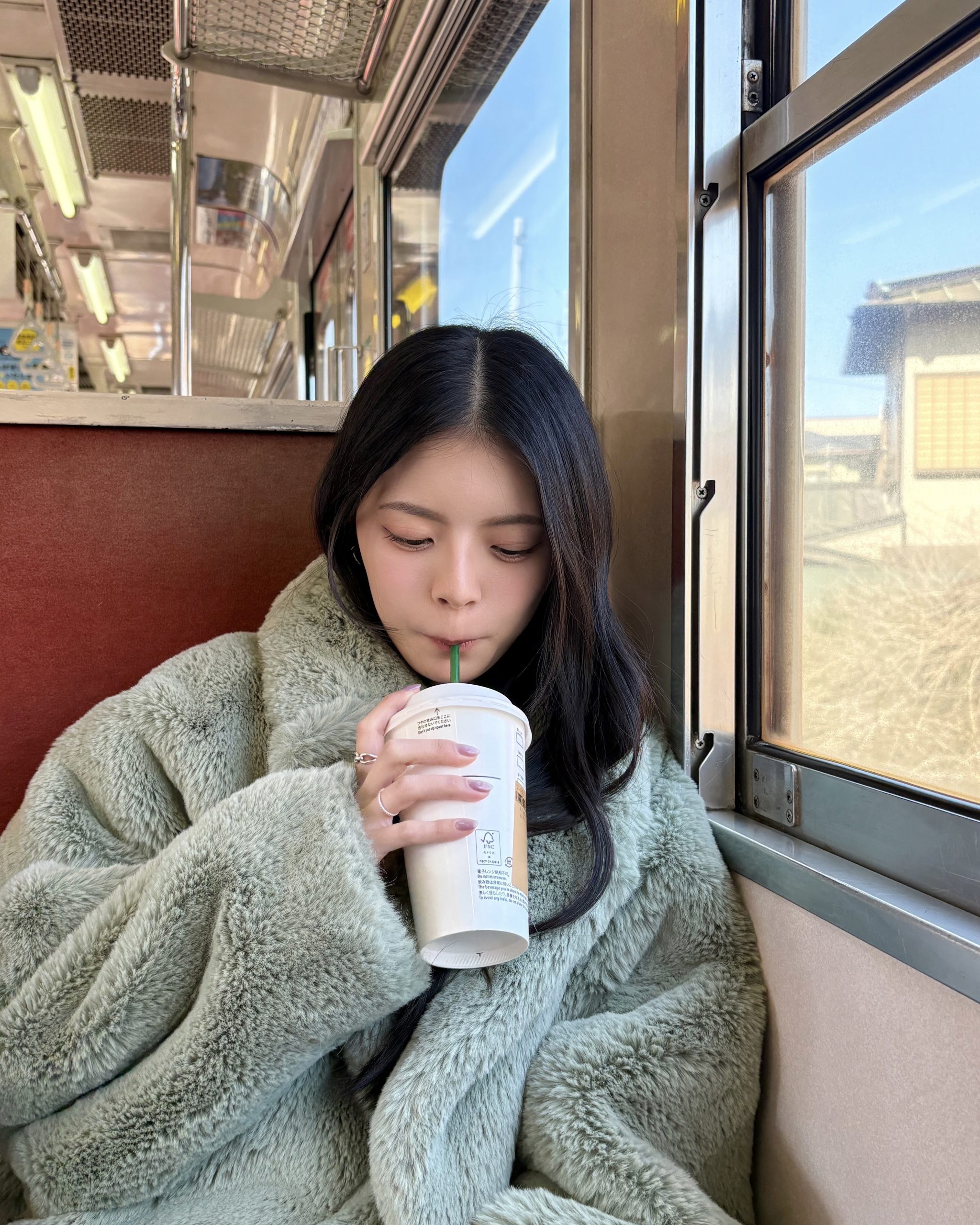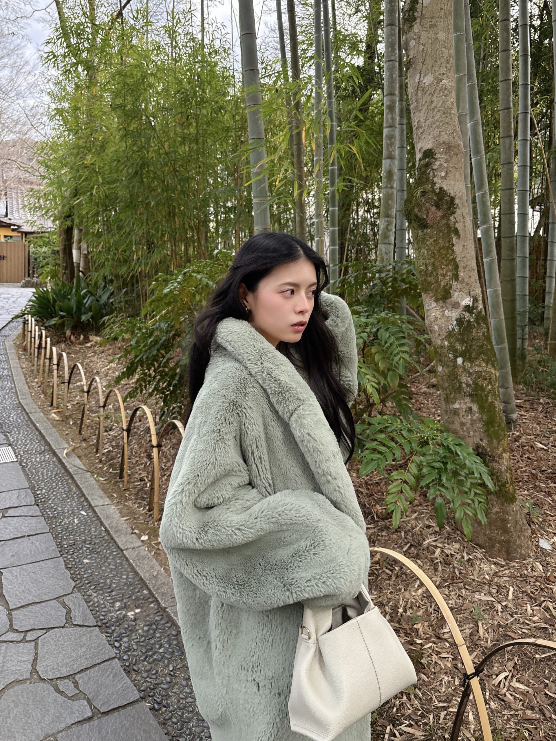 今回は『THINK FUR(シンクファー)』のパステルグリーンのファーコートを着ていったのですが、竹の風景とマッチして気分も上がりました♡