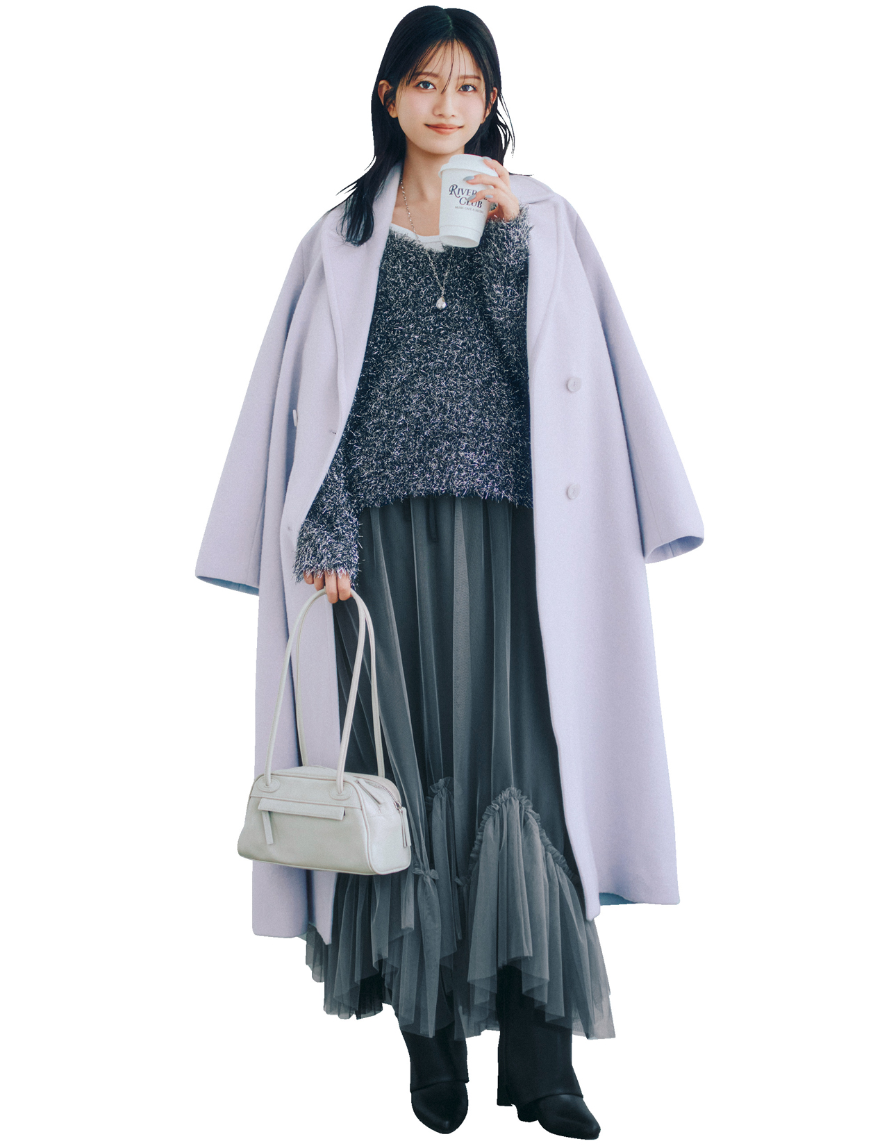 コート¥24,200(MERCURYDUO ルミネエスト新宿店<MERCURYDUO>)、ニット¥34,000(シーニュ)、中に着たタンクトップ¥6,600(AKTE)、スカート[ペチコート付き]¥18,700(ラ トータリテ 有楽町マルイ店<ラ トータリテ>)、バッグ¥21,560(HANA KOREA<CHRISTINE PROJECT>)、靴¥29,700(セムインターナショナル<REMME>)、ネックレス¥3,960(フィービィー)