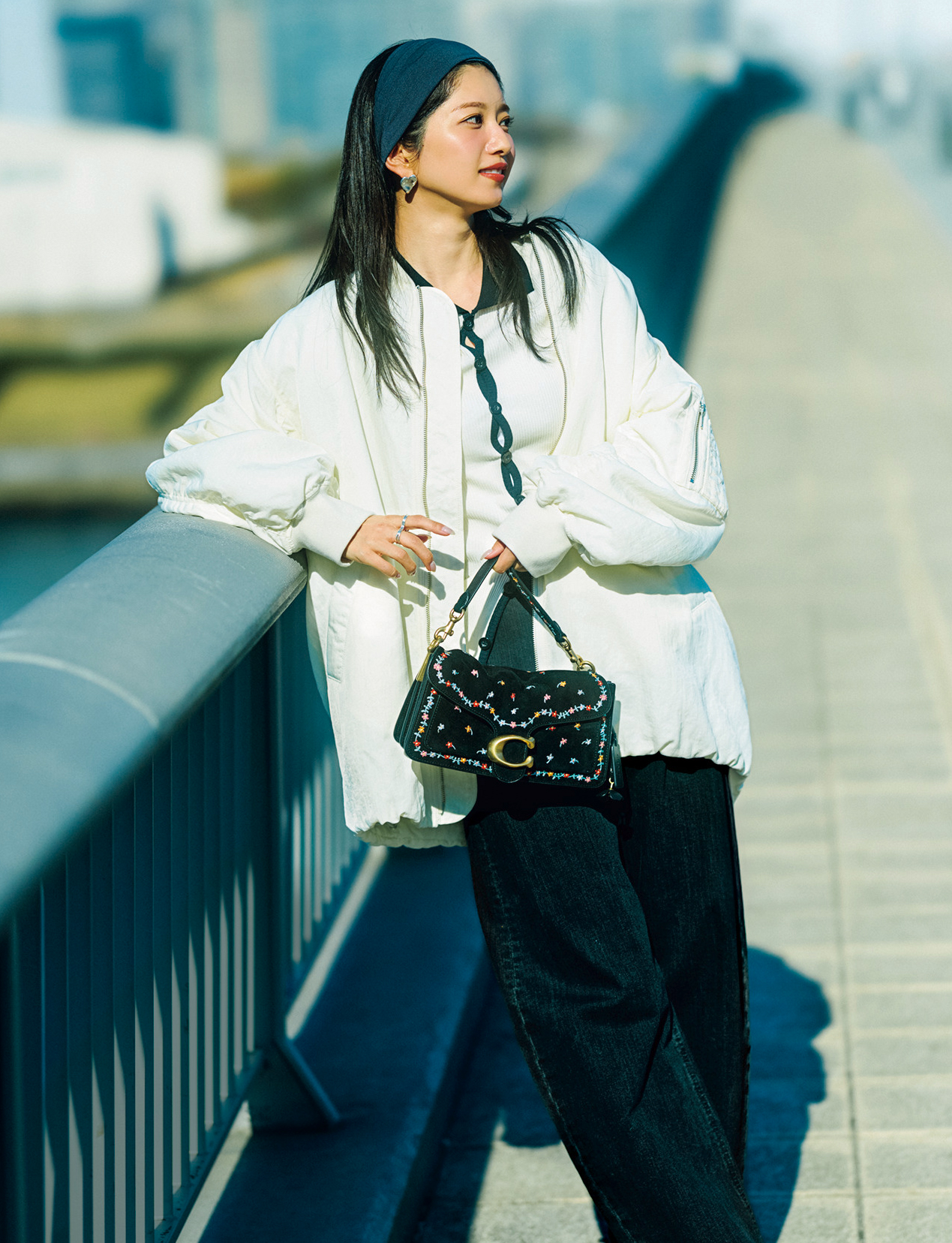 ブルゾンにポロニット、デニムを合わせたスポーティなスタイルも、白黒のコントラストでグッと都会的に! 地金アクセでキレよく仕上げつつ、カラフルなエンブロイダリーのバッグで遊び心をひとさじ。