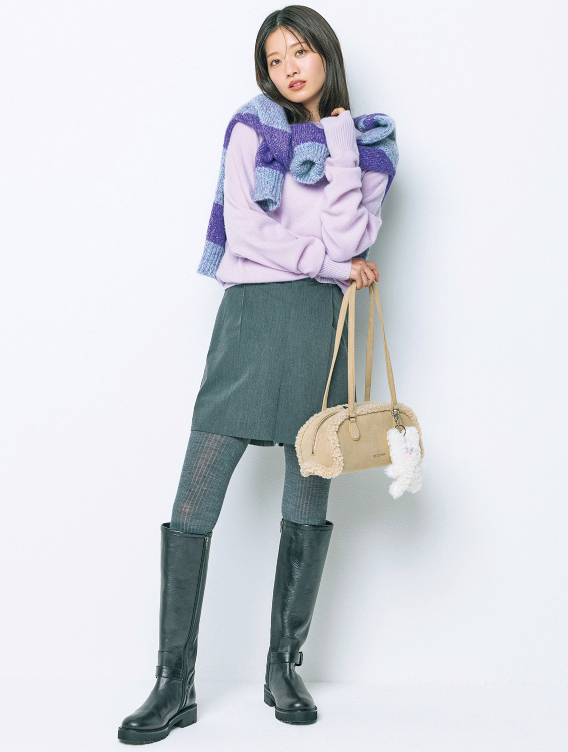 ラベンダー×グレーのフェミニン配色コーデに、キャッチーな肩がけカーデで変化球を。カーデとショーパンで目線を上げれば、脚長効果も◎。