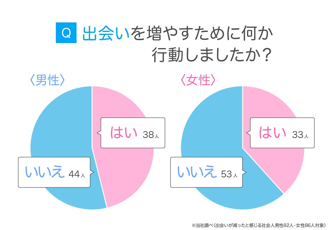 出会いが減ったと感じている人に「出会いを増やすために何か行動しましたか?」を尋ねたところ、「はい」と回答した人は約4割にとどまりました。