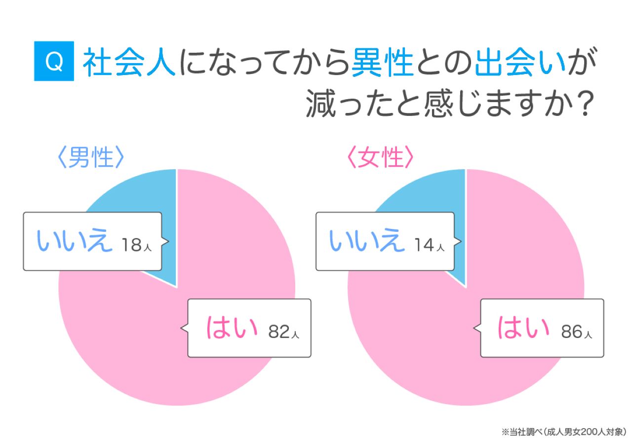 結果は男女ともに約8割が「はい」と回答! この結果からも、社会人になることで多くの人が出会い減っていると実感しているようですね。