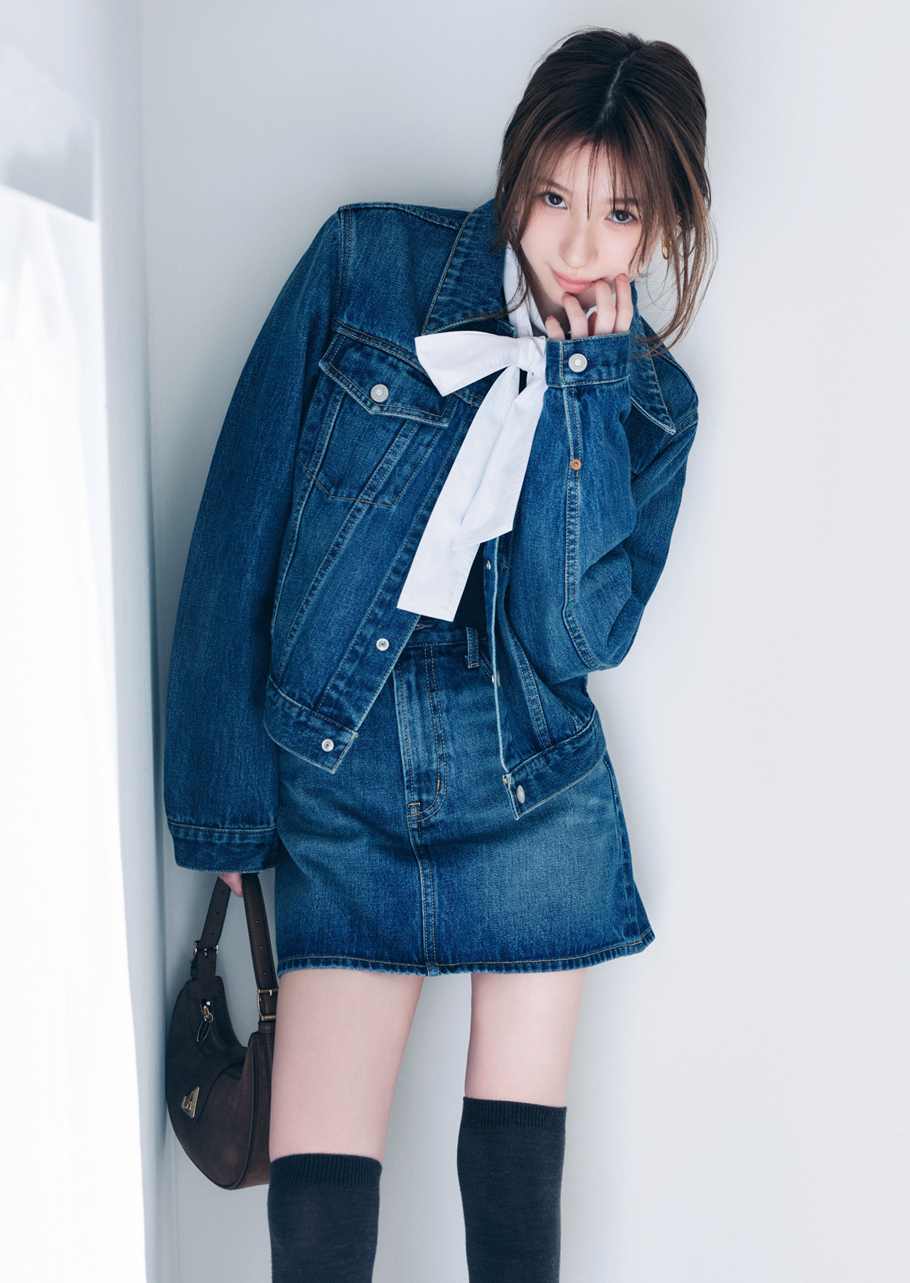 簡単にワントーンコーデが完成するデニムセットアップは、即今っぽく洒落るからあか抜け初心者にもオススメ。ボウタイシャツを入れて、キレイ見えカジュアルに仕上げて。