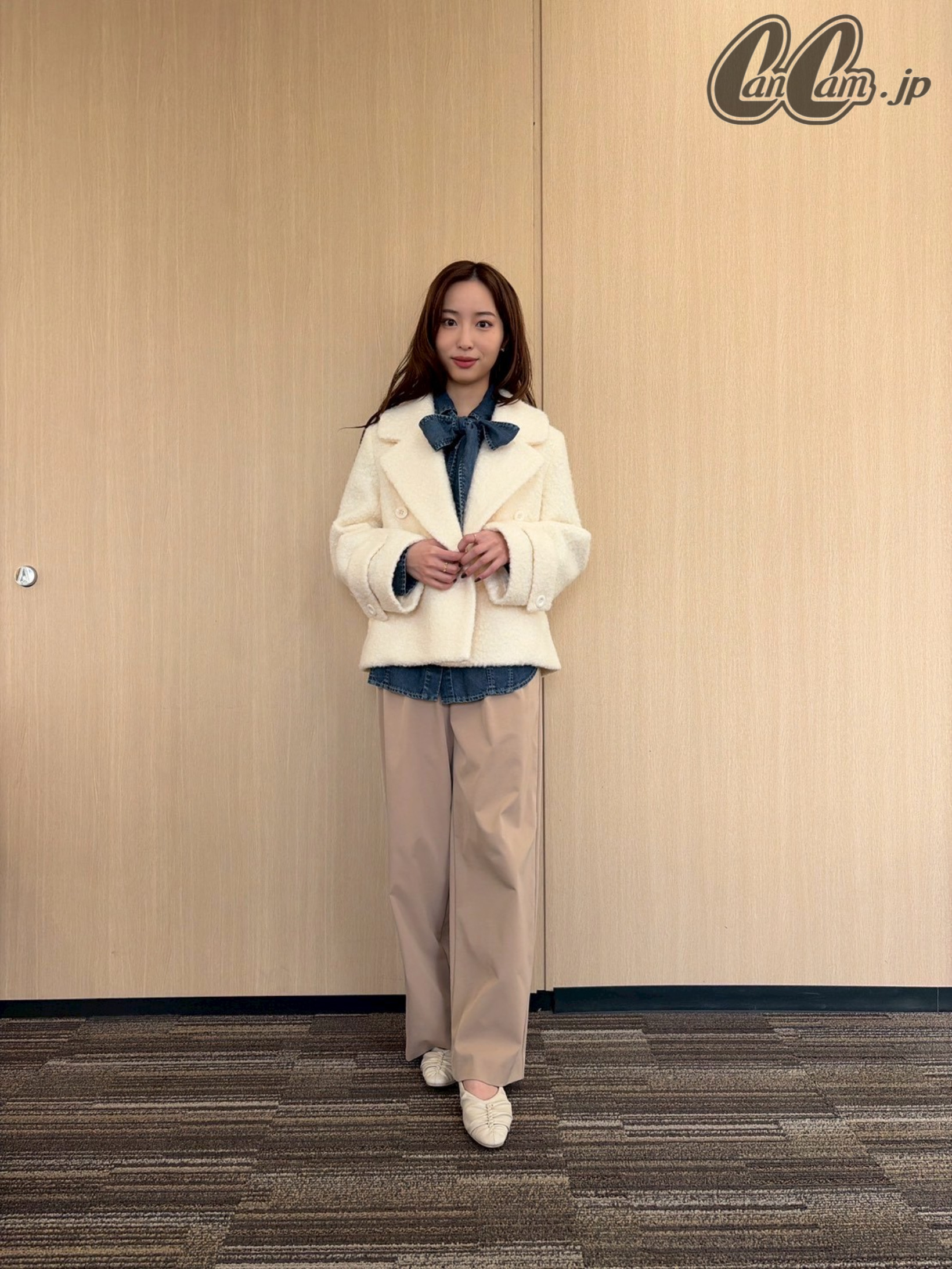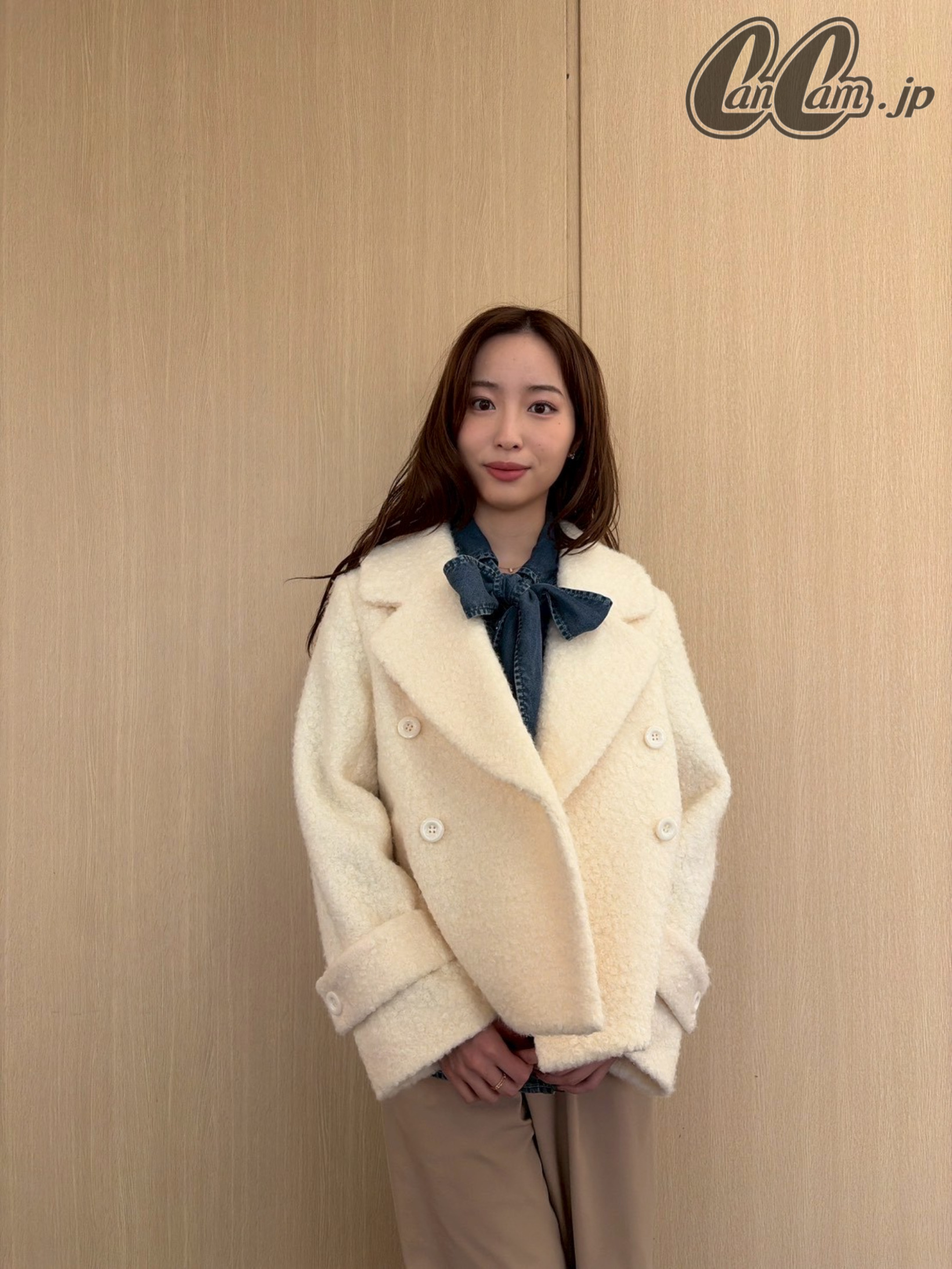 同系色でまとめて柔らかな印象に♡【林さんのアイボリーショートコート着用画像6枚】