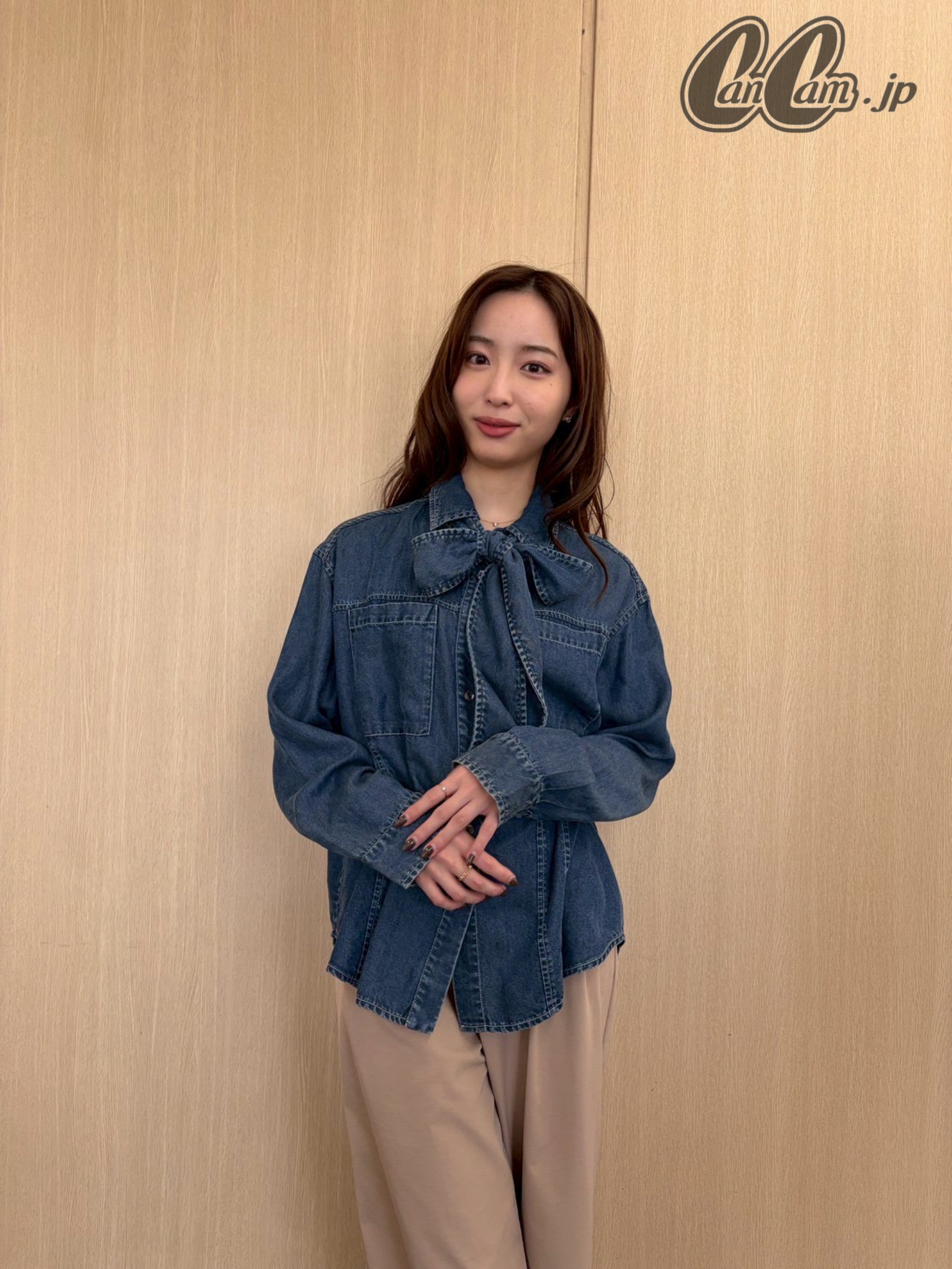 こなれ感と甘さを1枚で叶えてくれるボウタイ付きのデニムシャツ。大きなリボン結びを作り胸元からのぞかせたら、顔周りがパッと華やかに。アイボリーコートの明るい雰囲気も手伝って着映えが叶う♪