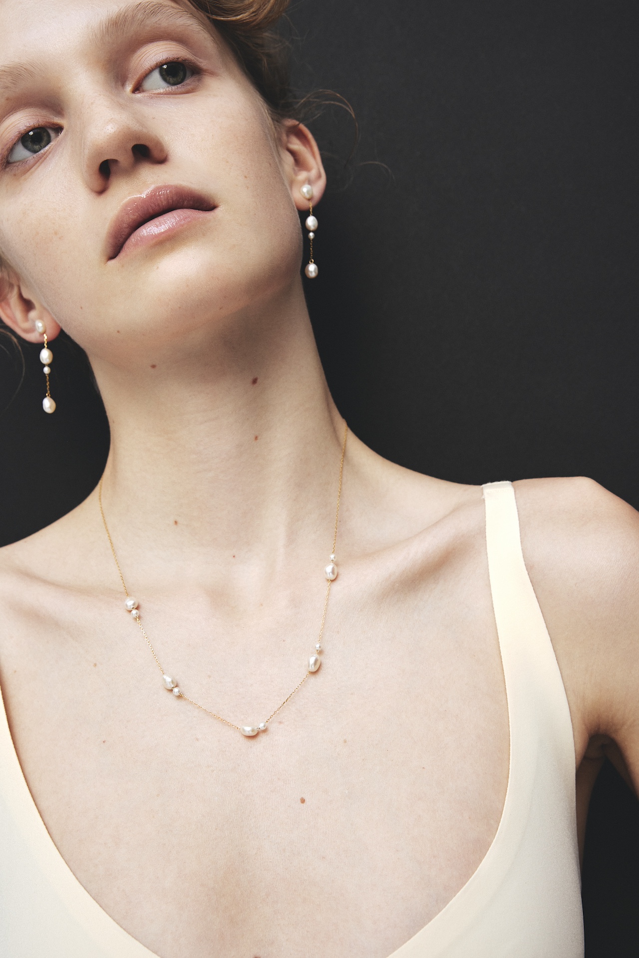 ブラックスピネルと淡水パール、異なる質感が交差するネックレス。時間の流れを刻んだようなパールの形が、天然石の静けさに揺らぎを与えて奥行きを演出。鎖骨下にかかる長さは、服のネックラインを選ばず合わせやすい! モノトーンのスタイルに重ねて質感の違いを楽しんで。
