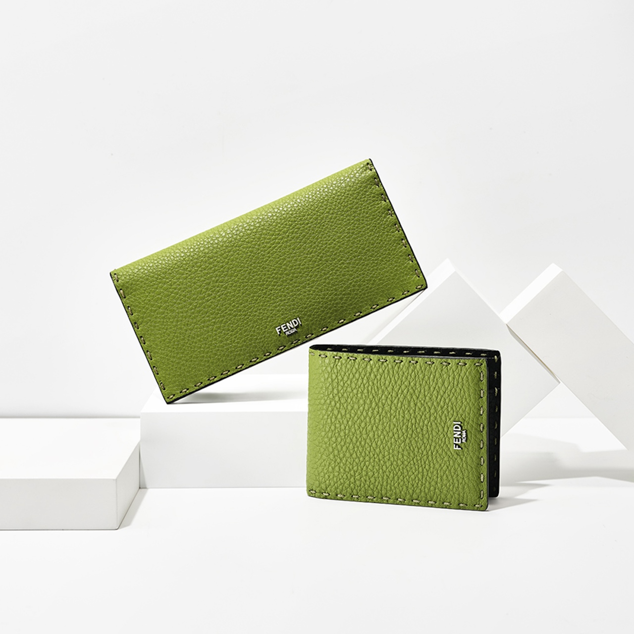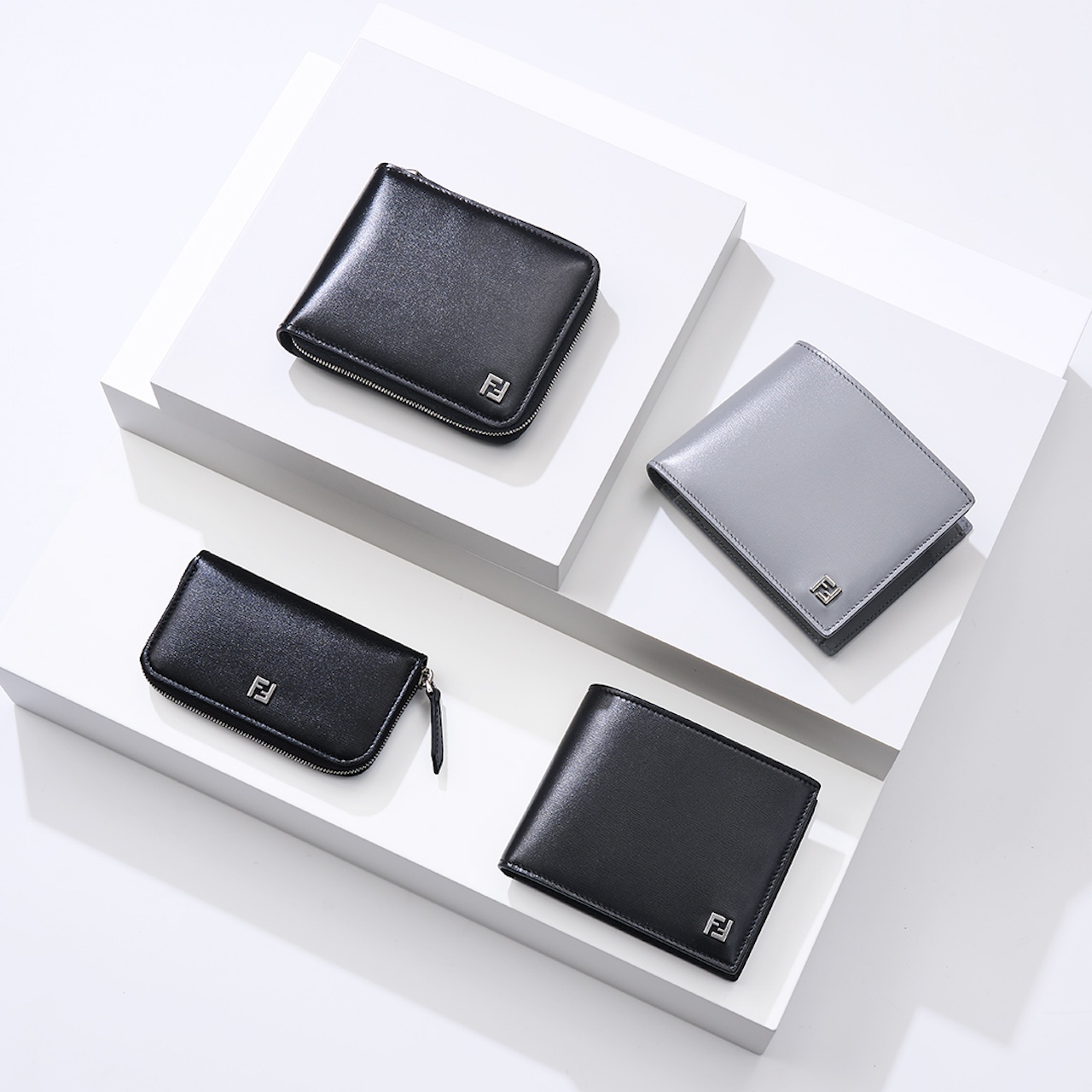 「FF スクエア」二つ折りウォレット¥75,900(H9×W12cm)、「FF スクエア」ジップ付き二つ折りウォレット¥107,800(H9×W12×D2cm)