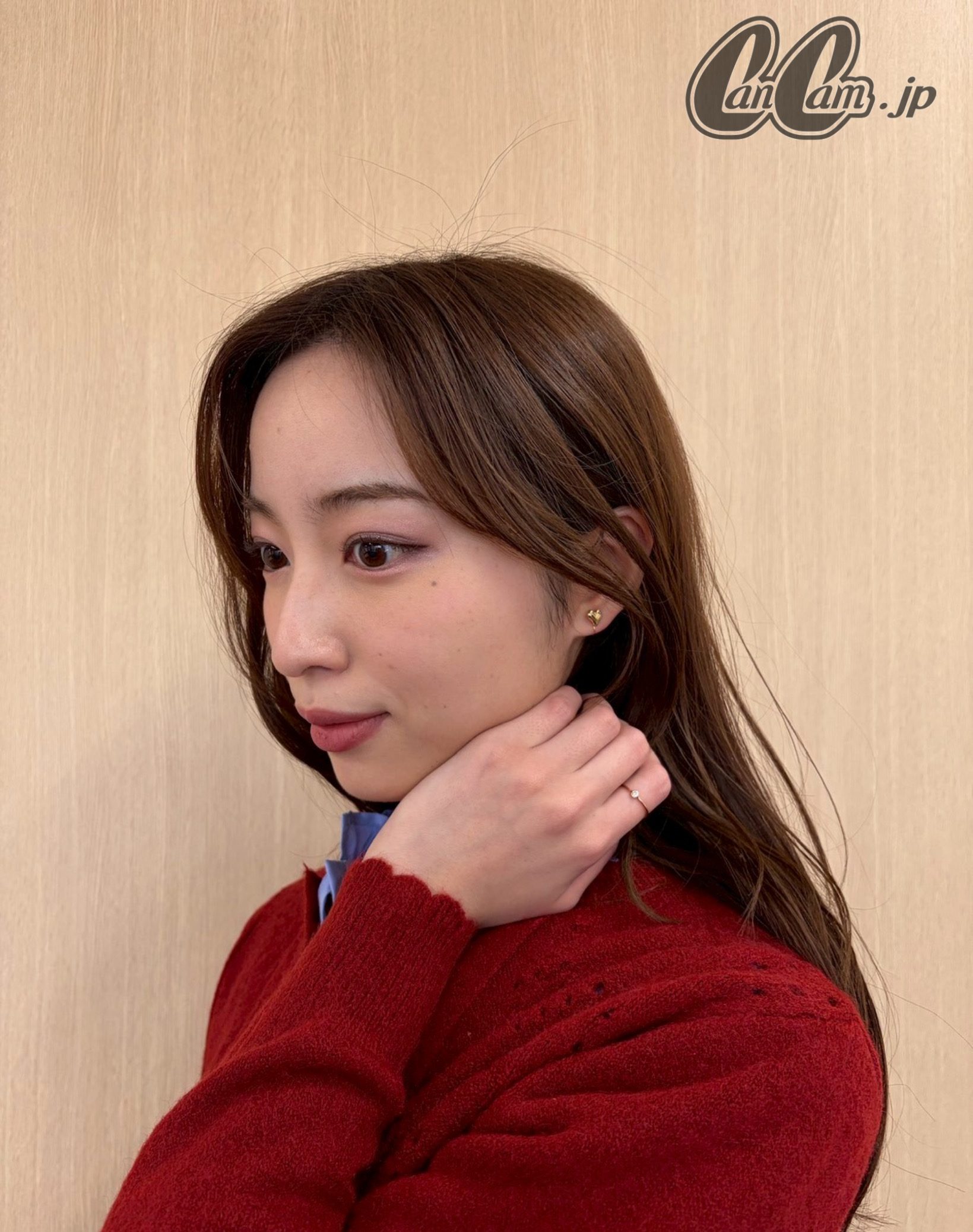 チェックコートから赤カーデをのぞかせた、上品なトラッドスタイル。カーディガンにはフリルシャツをレイヤードして洒落感アップ。赤×ブルーの上級者なカラーMIXも手伝って一歩先ゆく印象に。