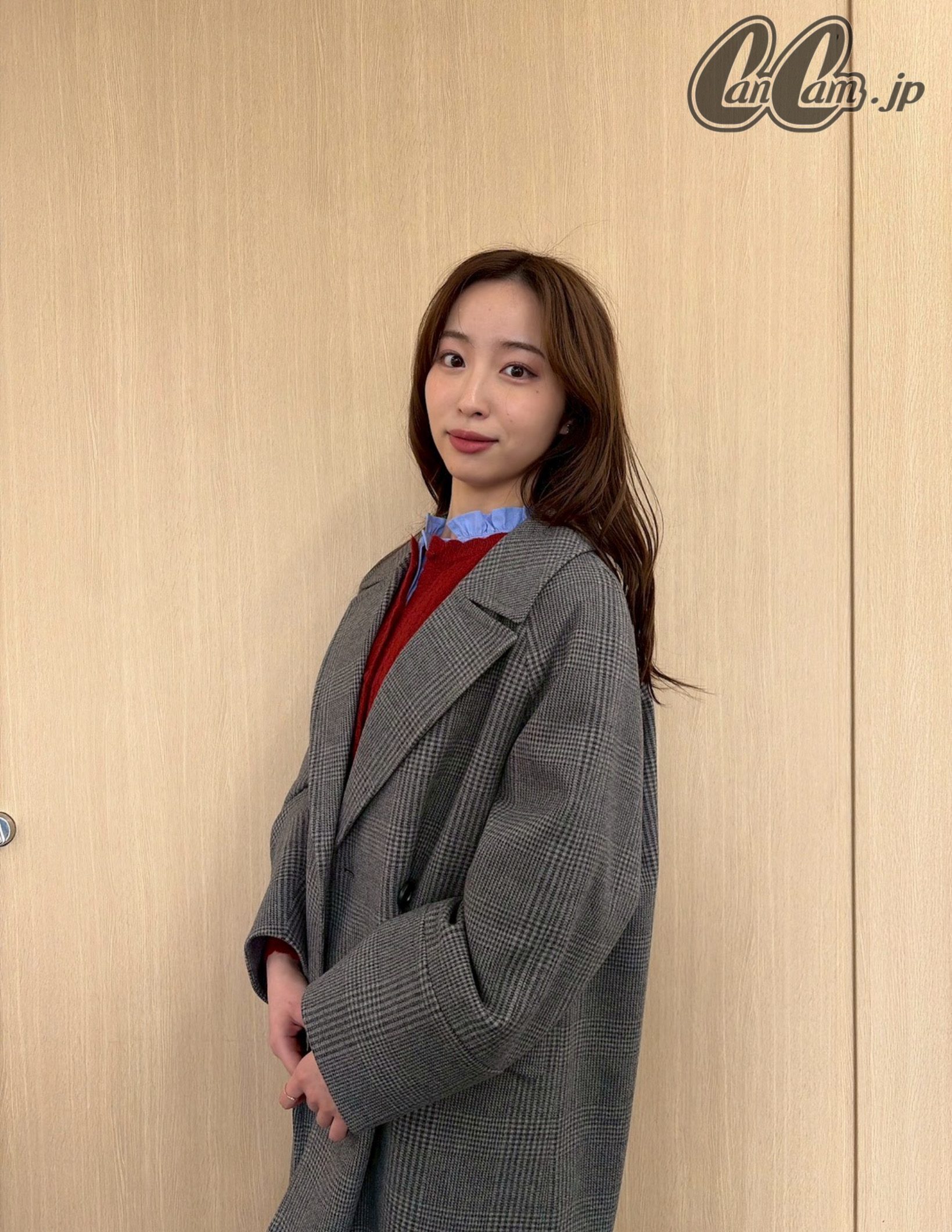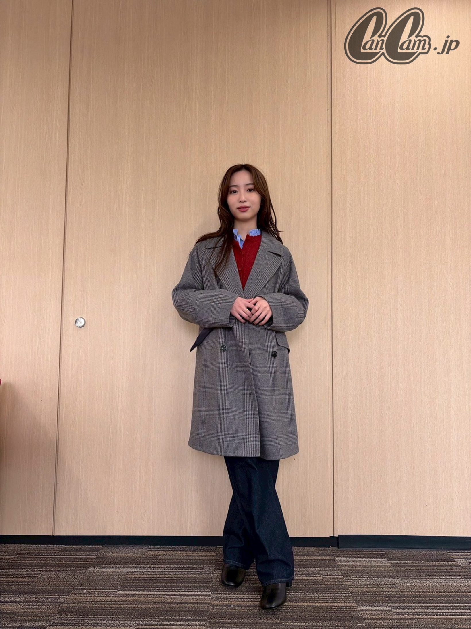 グレーが抜け感とこなれ感を演出【林さんのグレーチェックコート着用画像3枚】