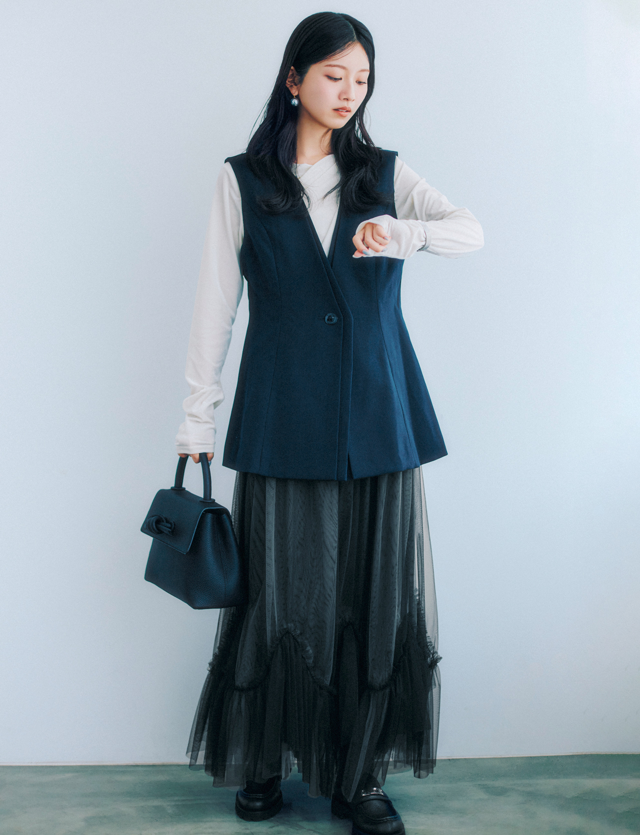 カットソー¥15,400(LOUNIE/ルーニィ)、ジレ¥36,300(ウィークエンド)、スカート[ペチコート付き]¥18,700(ラ トータリテ 有楽町マルイ店<ラ トータリテ>)、バッグ¥56,100(ヴァジックジャパン<VASIC>)、靴¥35,200(銀座かねまつ6丁目本店<銀座かねまつ>)、ピアス¥3,080(フィービィー)、時計¥40,700(ココシュニック)