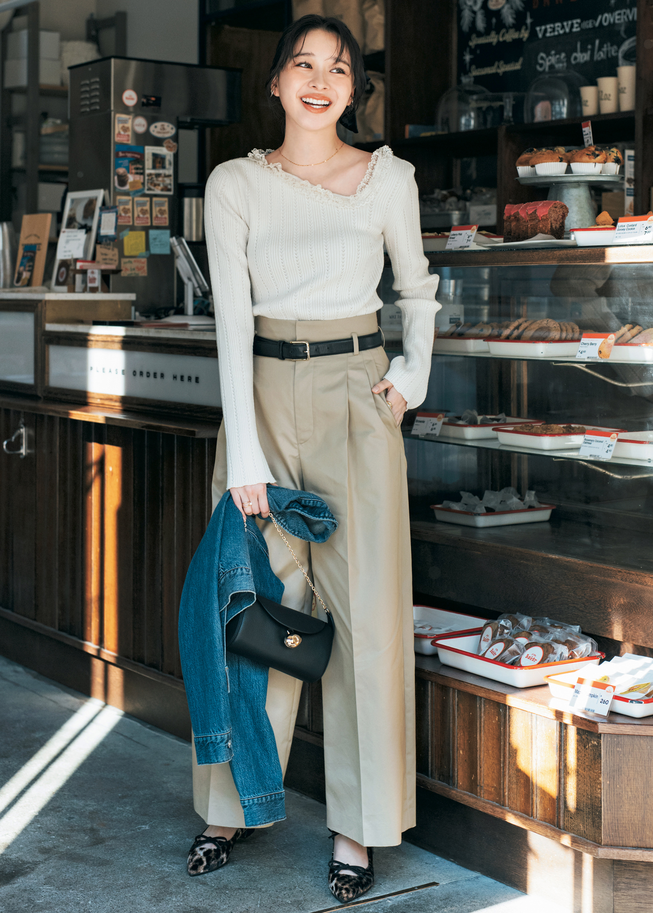 ニット¥17,600(CODE A ルミネ新宿店<CODE A>)、パンツ¥25,300(オンワード樫山<アンクレイヴ>)、手に持ったジャケット¥21,890(バロックジャパンリミテッド<マウジー>)、バッグ¥59,400(Cafuné)、靴¥17,600(ダイアナ 銀座本店<ダイアナ>)、ヘアクリップ¥1,320(アネモネ/サンポークリエイト)、イヤリング¥19,800(Jouete)、ネックレス¥44,000(ココシュニック)、リング[右手]¥2,640(フィービィー)、[左手]¥36,300(ete)、ベルト/スタイリスト私物