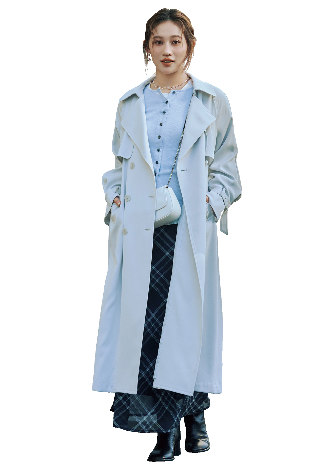 ワントーン調の着こなしを楽しむのも最適な、とろみ素材のブルートレンチコーデ。色違いのカーデを2枚重ねるテクニックで、鮮度UPを図って。