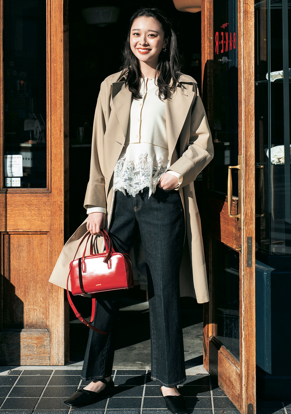 旬のペプラムで鮮度をさらに高めたレース付きアンサンブル。インディゴデニムやトレンチで大人のフレンチスタイルに。ぱっと印象に残る赤を差し色に加えて、華やかさを底上げ。