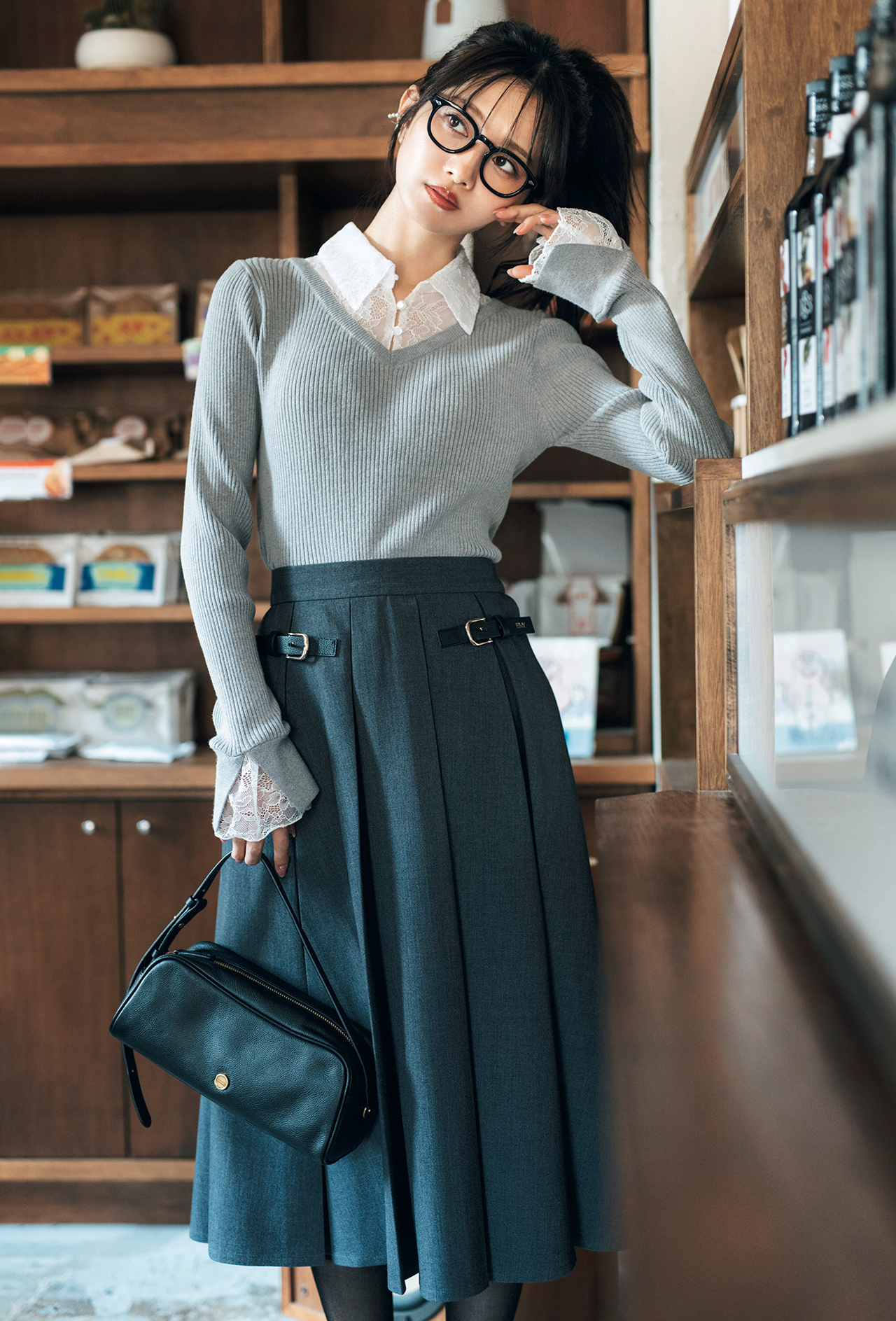 ニット¥9,493(NATURAL BEAUTY BASIC)、スカート¥25,300(EIMY ISTOIRE ルミネ新宿 ルミネ2)、バッグ¥29,700(LEMEME)、靴下¥990(タビオ<靴下屋>)、メガネ¥49,500(モスコット アオヤマ<モスコット>)、イヤカフ¥2,970(フィービィー)