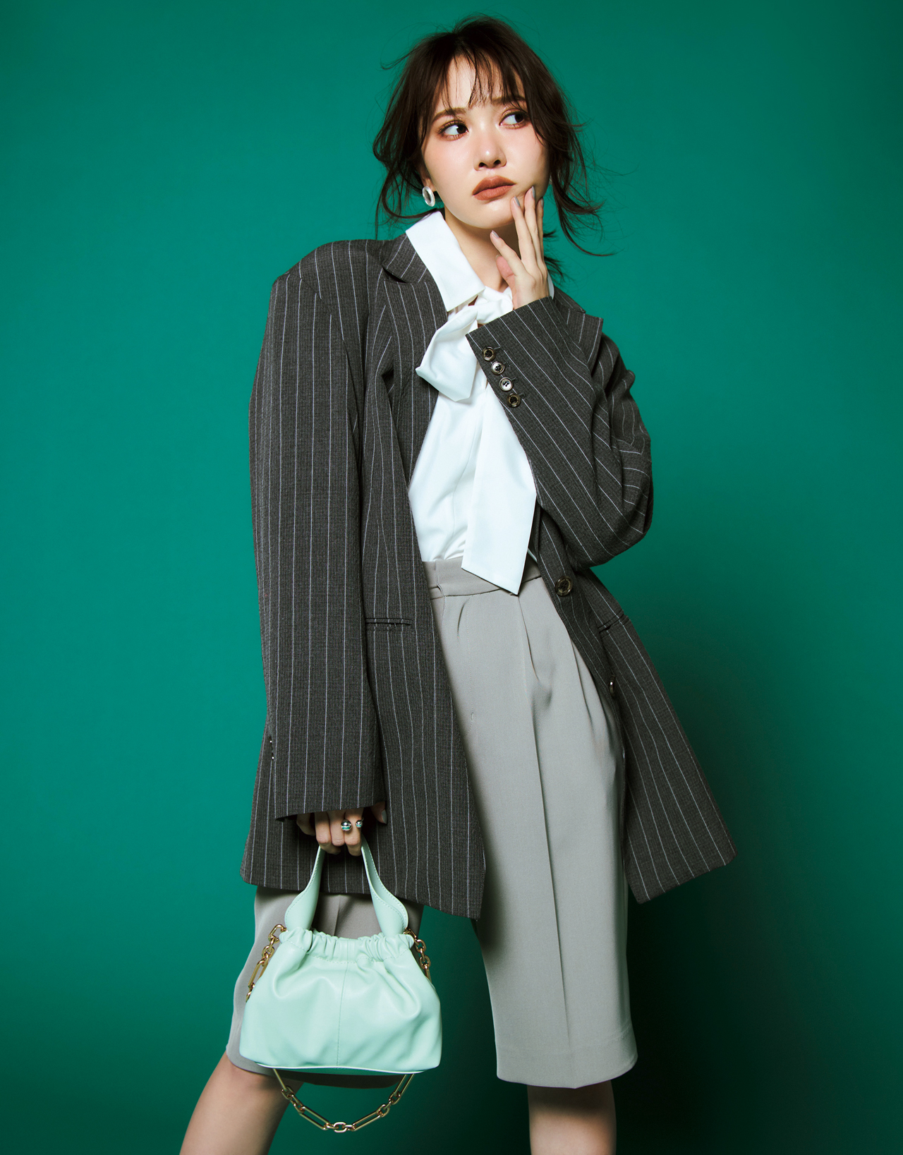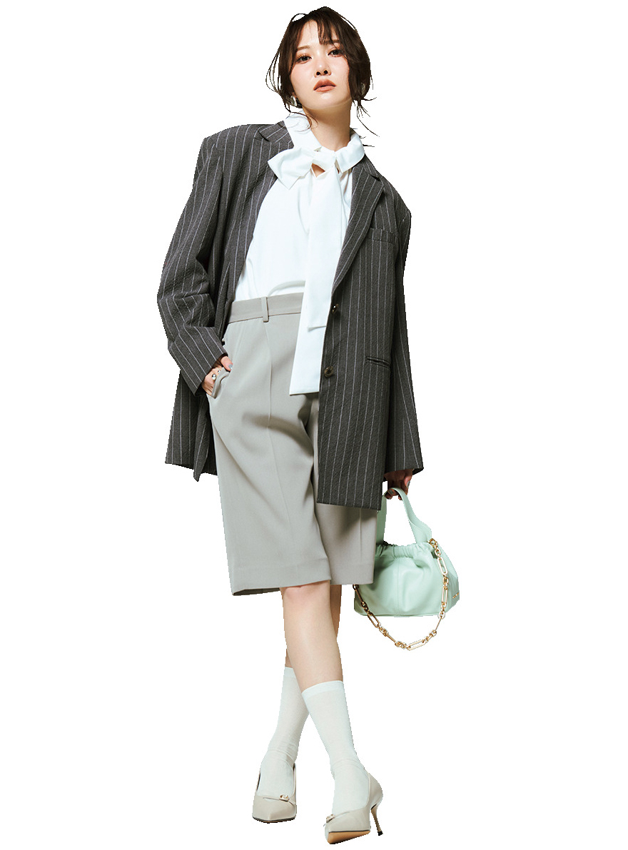 パンツ¥22,000(CODE A ルミネ新宿店<CODE A>)、ジャケット¥77,000(フィルム<Sov.>)、ブラウス¥8,998(NATURAL BEAUTY BASIC)、バッグ¥9,900・靴¥14,900(CHARLES & KEITH)、靴下¥1,320(17℃ by Blondoll 横浜ジョイナス店<17℃>)、ピアス¥8,360(ズットホリック<アドラル>)、リング¥17,600(アガット<アガット>)