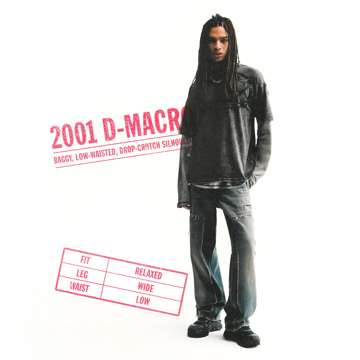 パッチワーク風のディテールが印象的なリラックスフィットデニムパンツ「2001 D-MACRO」。独特の存在感と奥行きがあり、いつものデニムスタイルにさりげなく変化を加えてくれる一本。ストリートテイストとも相性の良いワイドレッグも特徴。ストレッチのないしっかりとしたコットンデニム地で仕立てており、無骨さとモダンさを兼ね備えたデザインに仕上がっています。