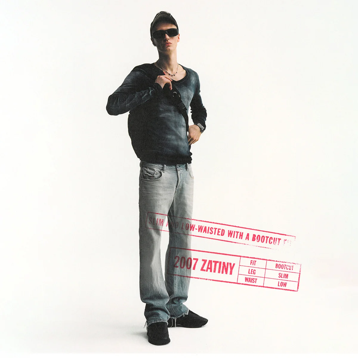 ブーツカットフィットのデニムパンツ「2007 ZATINY」。ローウエストでスリムレッグのシルエットに仕上げられており、すっきりと着用できる。ダメージや独特のシワ感、レジン製のウエストボタンなど、シンプルながら個性が光るディテールもポイント。わずかにストレッチが効いているため、細身でありながら動きやすさも◎。