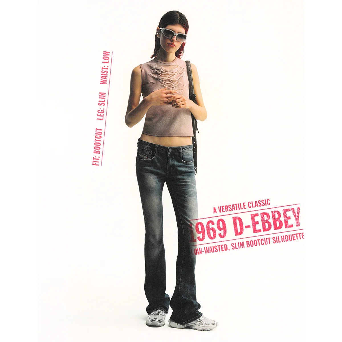 濃淡の色合いが印象的なデニムパンツ「1969 D-EBBEY」。脚のラインをすっきりと美しく引き立てるブーツカットフィット&スリムレッグが特徴的。しっかりとした風合いのノンストレッチデニムを採用していて、デニム特有のカジュアルさと女性らしさを兼備。
