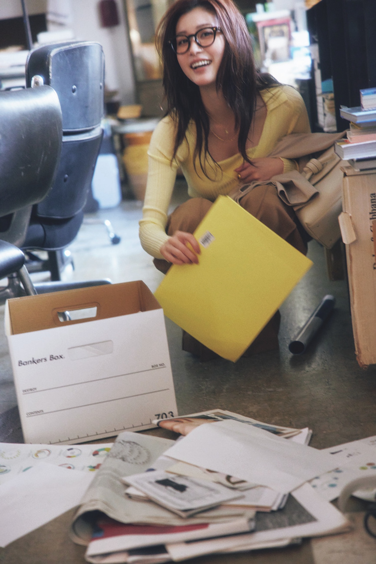 パンツ¥32,500(シーニュ)、カーディガン¥49,500(メゾン キツネ<メゾン キツネ>)、中に着たキャミソール¥17,600(カイタックインターナショナル<ヤヌーク>)、バッグ¥56,100(ヴァジックジャパン<VASIC>)、靴¥9,900(CHARLES & KEITH)、メガネ¥42,900(アイヴァン 東京ギャラリー<アイヴァン>)、ベルト¥2,970(ROPÉ PICNIC/ジュン)、手に持ったジャケット¥44,000(オンワード樫山<アンクレイヴ>)、ネックレス[2本セット]¥13,200(チビジュエルズ・ジャパン<chibi jewels>)、リング¥3,850(mimi33/サンポークリエイト)