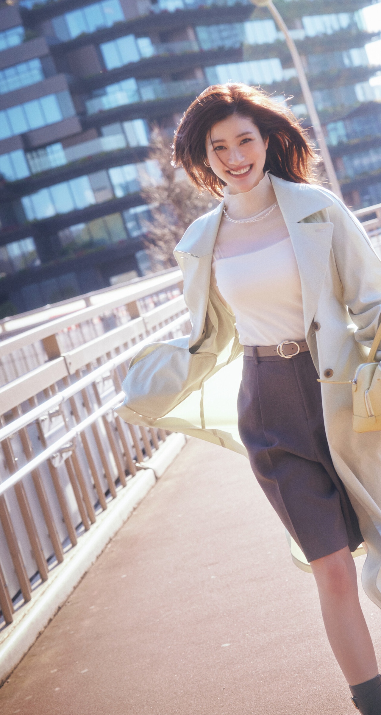 コート[共布ベルト付き]¥27,940(エメル リファインズ オンラインストア<EMMEL REFINES>)、カットソー¥9,900(ánuans)、パンツ¥5,489(ROPÉ PICNIC/ジュン)、バッグ¥53,900(ヴァジックジャパン<VASIC>)、靴¥51,920(HANA KOREA<UDIRE>)、ベルト¥13,200(LOUNIE/ルーニィ)、イヤカフ¥15,400・ネックレス¥88,000(アガット<アガット>)、リング¥12,650(ココシュニック<ココシュニック オンキッチュ>)、中に着たキャミソール/スタイリスト私物