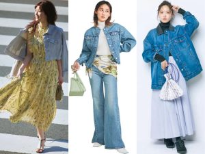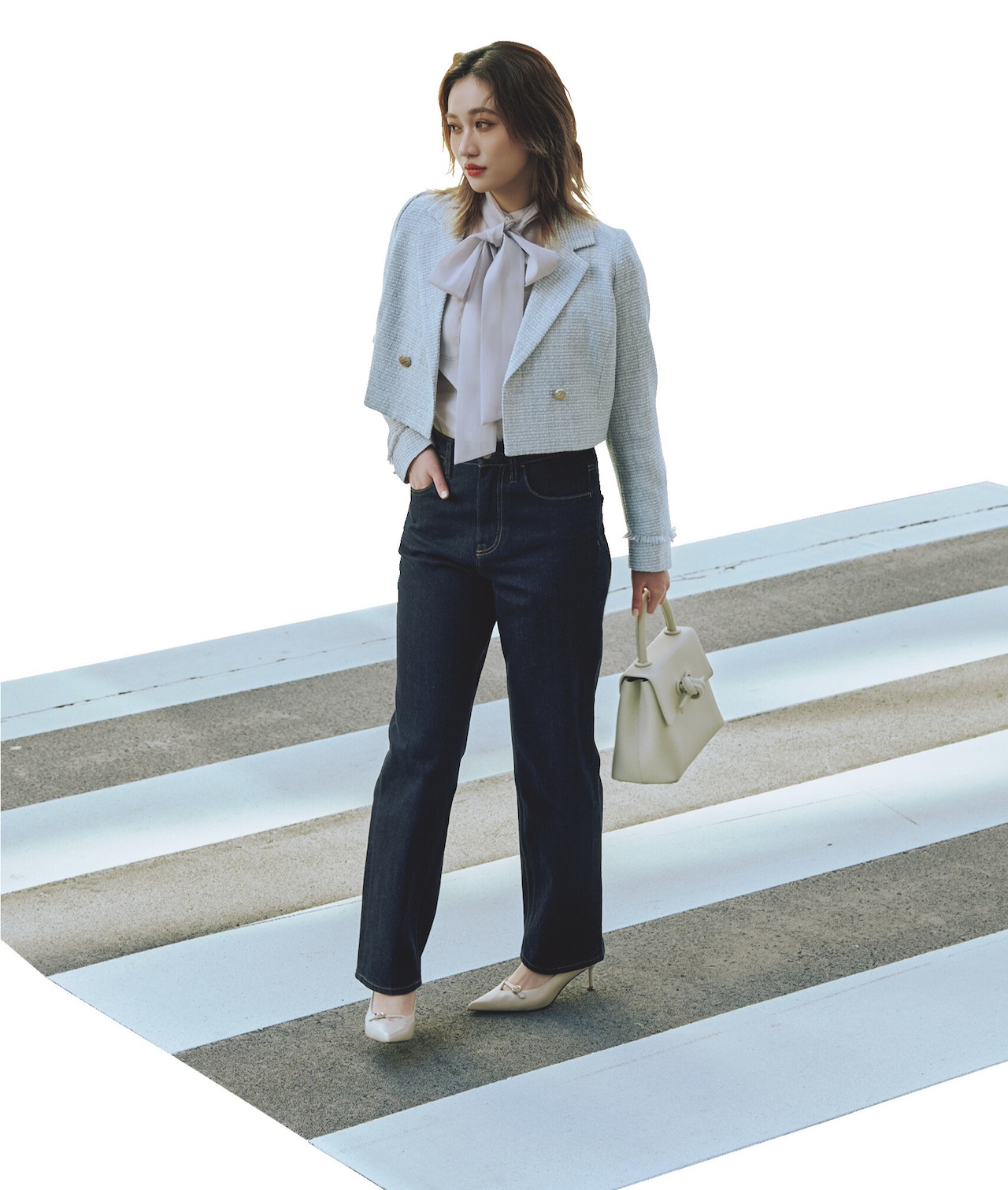 ボウタイブラウスとデニムとの合わせで、ツイードジャケットは間違いなくかわいく、今っぽく着られる! デニムをインディゴにして、しっかりきれいめをキープ。