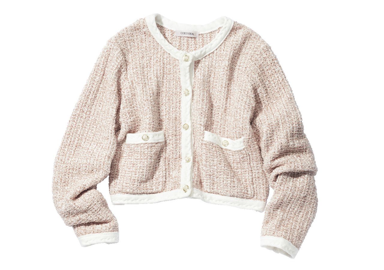 リボンチュールなど数種類の糸で編み上げられた、ほわほわした質感が、デイリーにちょうどいい映え感。ブレードパイピングや金ボタンで、きれいなお姉さんにふさわしいリッチ感もアピール。