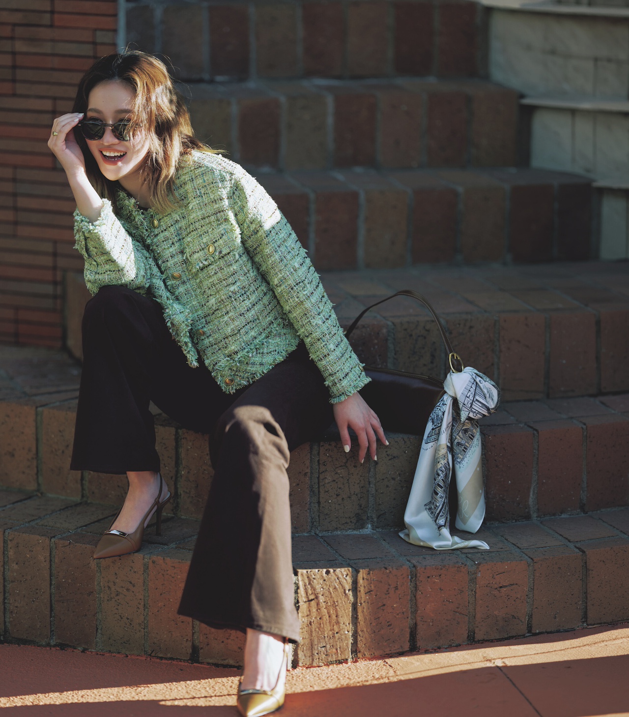 ジャケット¥66,000(TOMORROWLAND<Ballsey>)、パンツ¥48,400(シチズンズ・オブ・ヒューマニティ<シチズンズ・オブ・ヒューマニティ>)、バッグ¥8,800(アンビリオン<カカトゥ>)、バッグに付けたスカーフ¥3,289(ROPÉ PICNIC/ジュン)、靴¥9,900(CHARLES & KEITH)、サングラス¥52,800(モスコット アオヤマ<モスコット>)、リング¥7,480(チビジュエルズ・ジャパン<chibi jewels>)