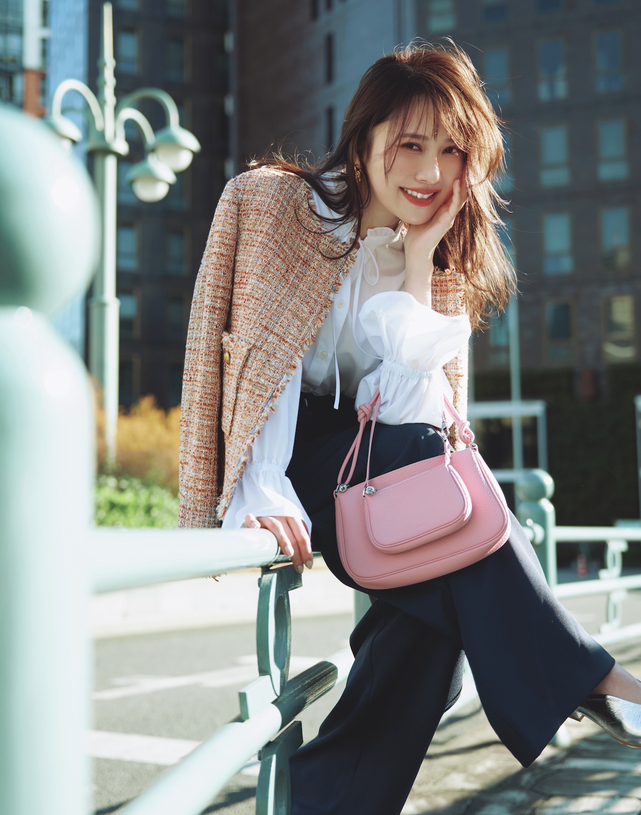 シックなボウタイブラウス×ネイビーワイドパンツに華やかさを足すように、ツイードジャケットを肩掛け。トリコロール配色が、〝パリっぽムード〟を盛り上げる。