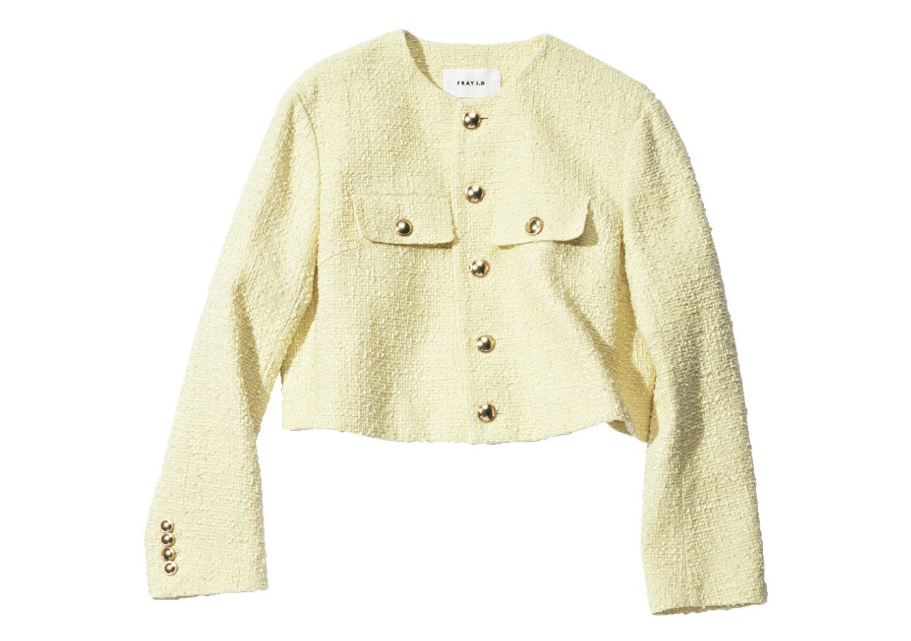 ブランドオリジナルのツイード生地にアンティーク風の金ボタンが、華やかさを添える。初めましてのシーンが増える春。表情が明るく見えるイエローで、第一印象からきれいめお姉さんになれる♪