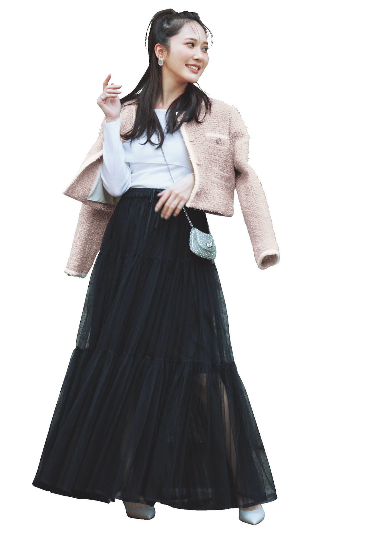 短丈ツイードジャケットをボリューミーなチュールスカートに合わせて、レディライクなオーラを放って。インナーをピタめニットにすることで、イイ女感も加わる。