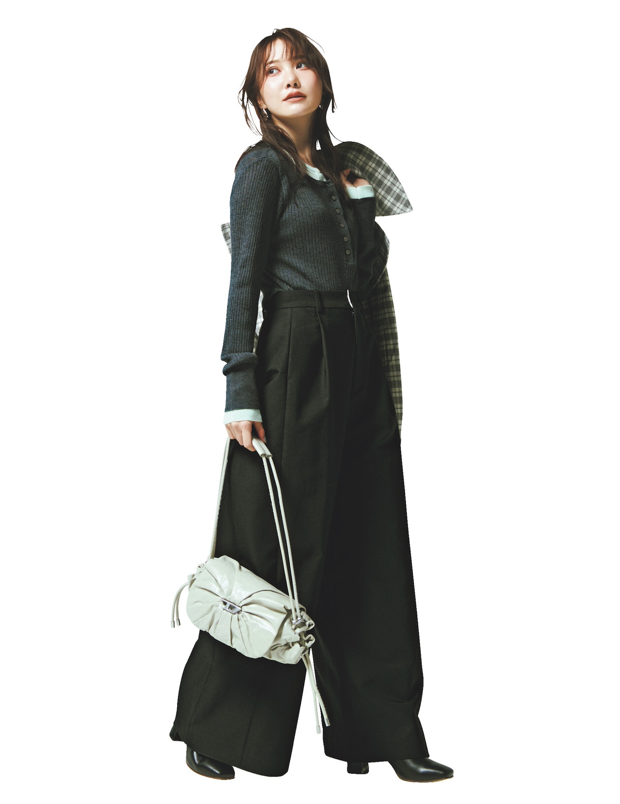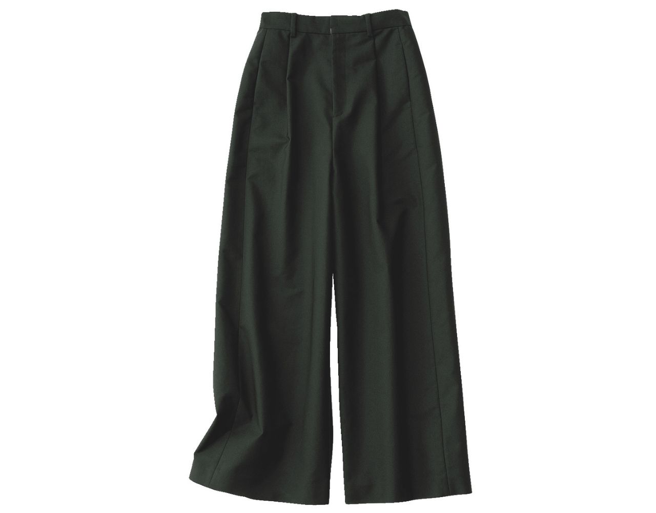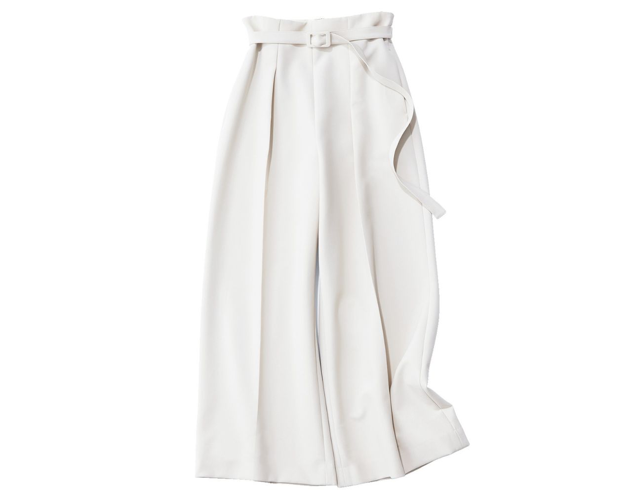 大胆なワイドシルエットながら、ヒップラインがきれいでだぶつきのない美シルエットに熱視線♡ 上半身はコンパクトにまとめて、ウエストを華奢にメイクする美脚ワイドの威力を存分に発揮!