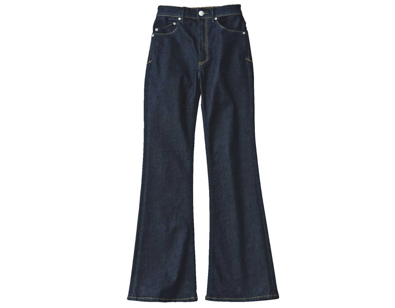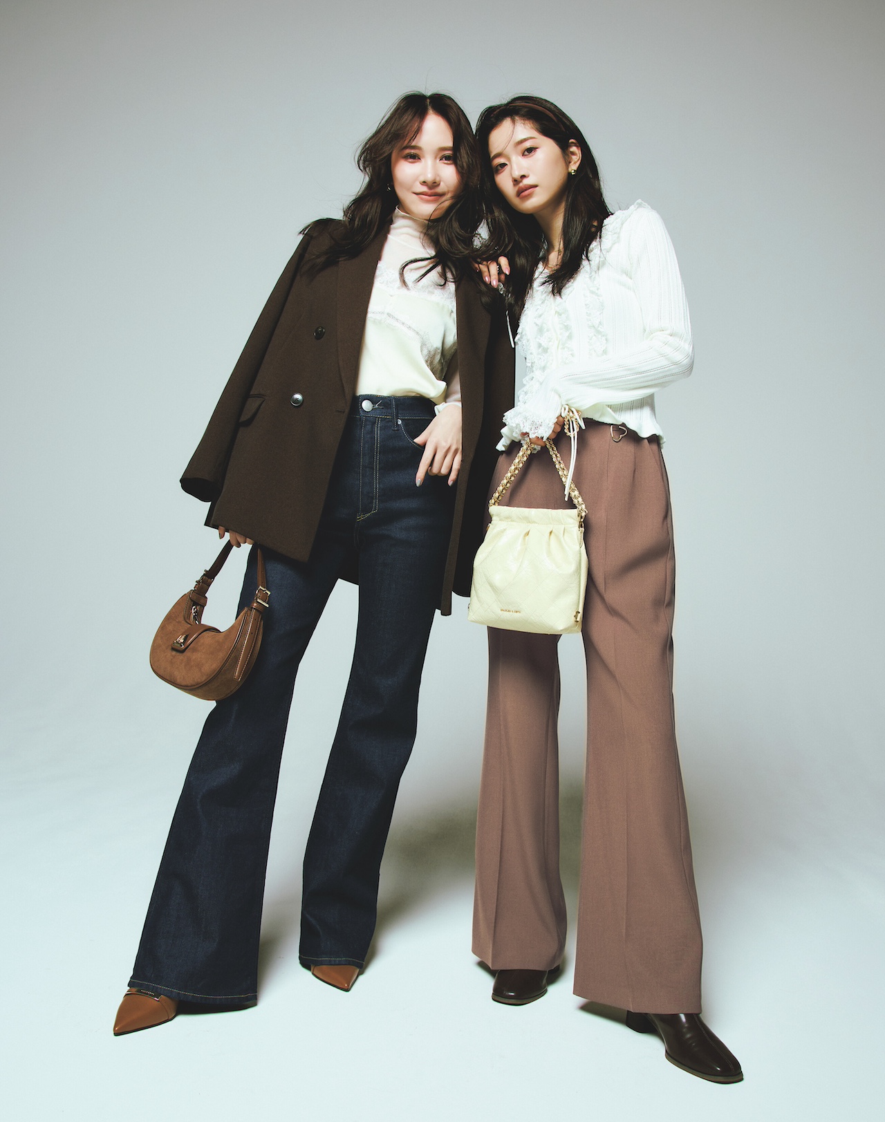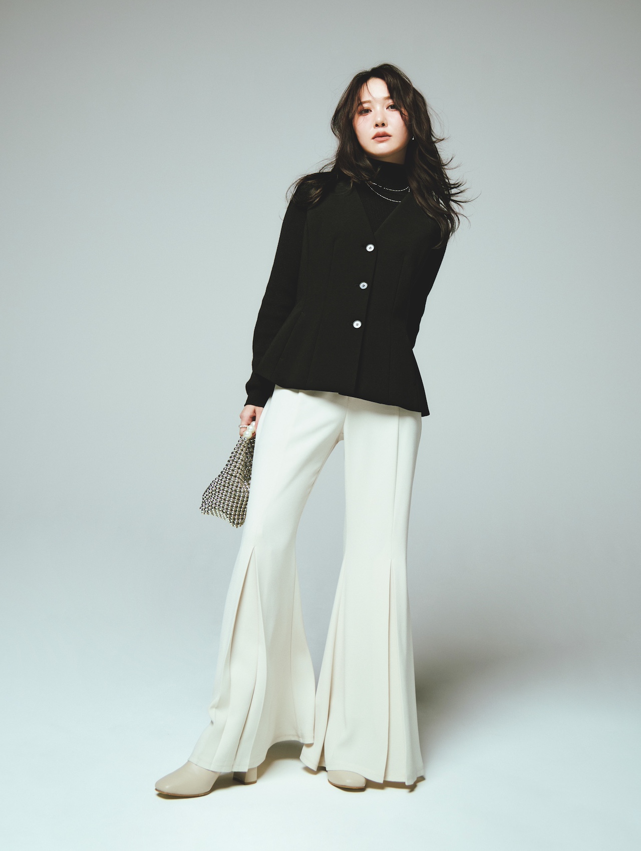 脚がきれいに見える絶妙フレアや高めに設定したひざ位置など、美脚にこだわって作られた〝SHANNY〟。ヤヌーク独自のストレッチ素材で、はき心地も◎。BIGジャケットとの対比で、ほっそり脚を強調して。