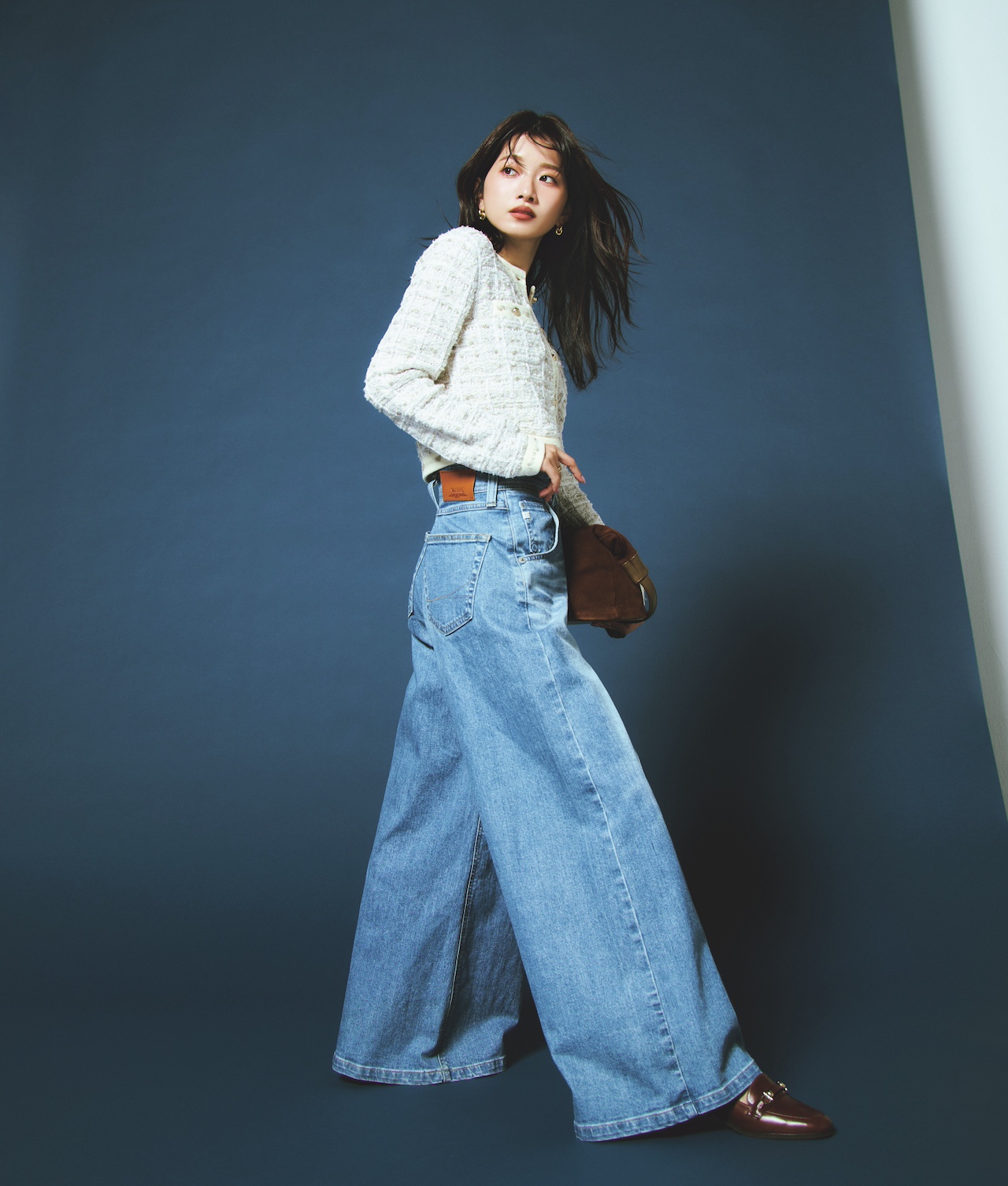 〝メンズのパンツをウエストでギュッと締めたイメージ〟で企画されたスーパーワイドデニム。高めの位置でタイトに設定されたウエストと太ももから下のギャップあるシルエットが「細見え効果がすごい!」と、色違いで購入する人も多数! ショート丈のツイードニットカーデで華やかさをトッピングしつつ、スタイル美人なAラインが完成。