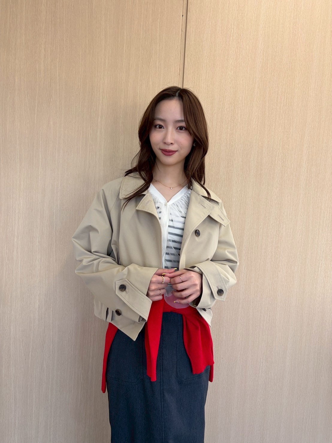 ■3/19(木)/ベージュショートトレンチコート×ネイビースカート